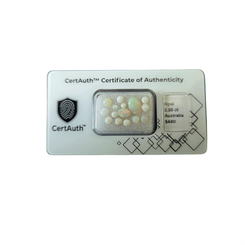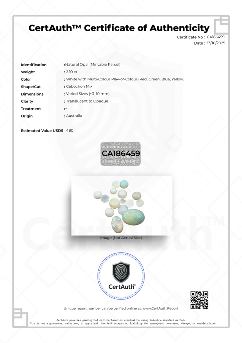 NATURAL 2.10CT WHITE OPAL MINTABIE PARCEL CABOCHON MIX WITH CERTAUTH DIGITAL CERTIFICATE This Natural Opal (Mintabie Parcel) Displays A White Body Colour With Multi-Colour Play-Of-Colour Including Red, Green, Blue, And Yellow. With A Total Weight Of 2.10 Ct, These Earth-Mined Opals Are Fashioned In A Cabochon Mix With Varied Sizes. This Listing Includes A Certauth Digital Certificate Of Authenticity For Secure Online Verification.• Gemstone: Natural Opal (Mintabie Parcel)• Carat Weight: 2.10 Ct• Colour: White With Multi-Colour Play-Of-Colour (Red, Green, Blue, Yellow)• Cut: Cabochon Mix• Clarity: Translucent To Opaque• Treatment: ~• Dimensions: Varied Sizes (~3–10 Mm)• Origin: Australia• Certification: Certauth Digital Certificate (Ca186459)• Estimated Value: $480 Usd Condition: Good - Refer Images 0488473+20
