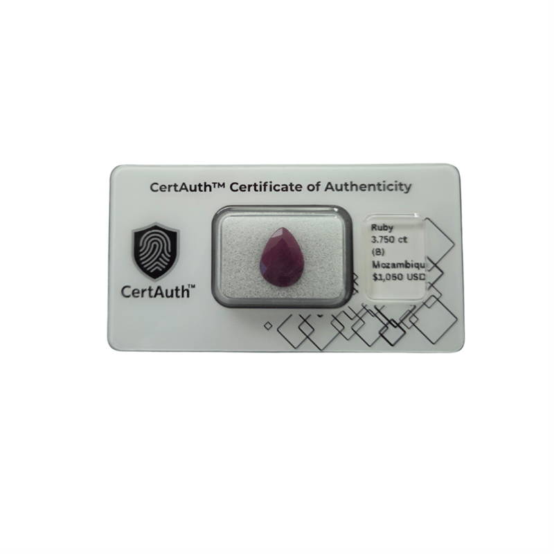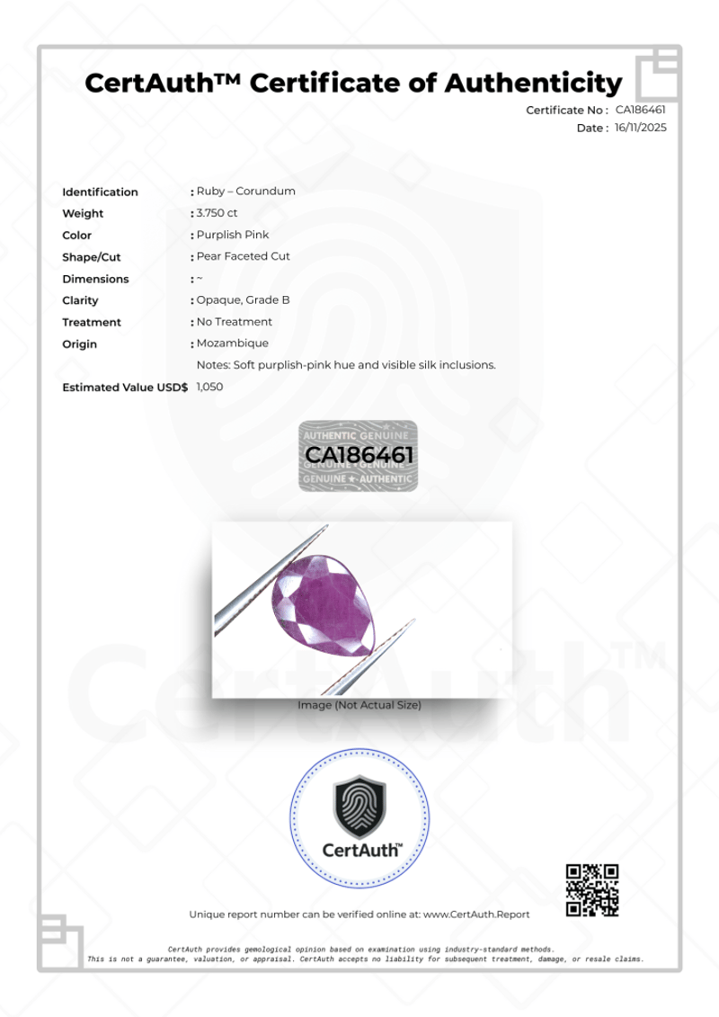 NATURAL 3.750CT PURPLISH PINK RUBY CORUNDUM PEAR FACETED CUT UNTREATED MOZAMBIQUE WITH CERTAUTH DIGITAL CERTIFICATE This Natural Ruby (Corundum) Displays A Purplish Pink Colour And Is Fashioned Into A Pear Faceted Cut. With A Weight Of 3.750 Ct And Opaque Grade B Clarity, This Earth-Mined Gemstone Shows No Treatment. This Listing Includes A Certauth Digital Certificate Of Authenticity For Secure Online Verification.• Gemstone: Ruby – Corundum• Carat Weight: 3.750 Ct• Colour: Purplish Pink• Cut: Pear Faceted Cut• Clarity: Opaque, Grade B• Treatment: No Treatment• Dimensions: ~• Origin: Mozambique• Notes: Soft Purplish-Pink Hue And Visible Silk Inclusions• Certification: Certauth Digital Certificate (Ca186461)• Estimated Value: $1,050 Usd Condition: Good - Refer Images 0488473+25