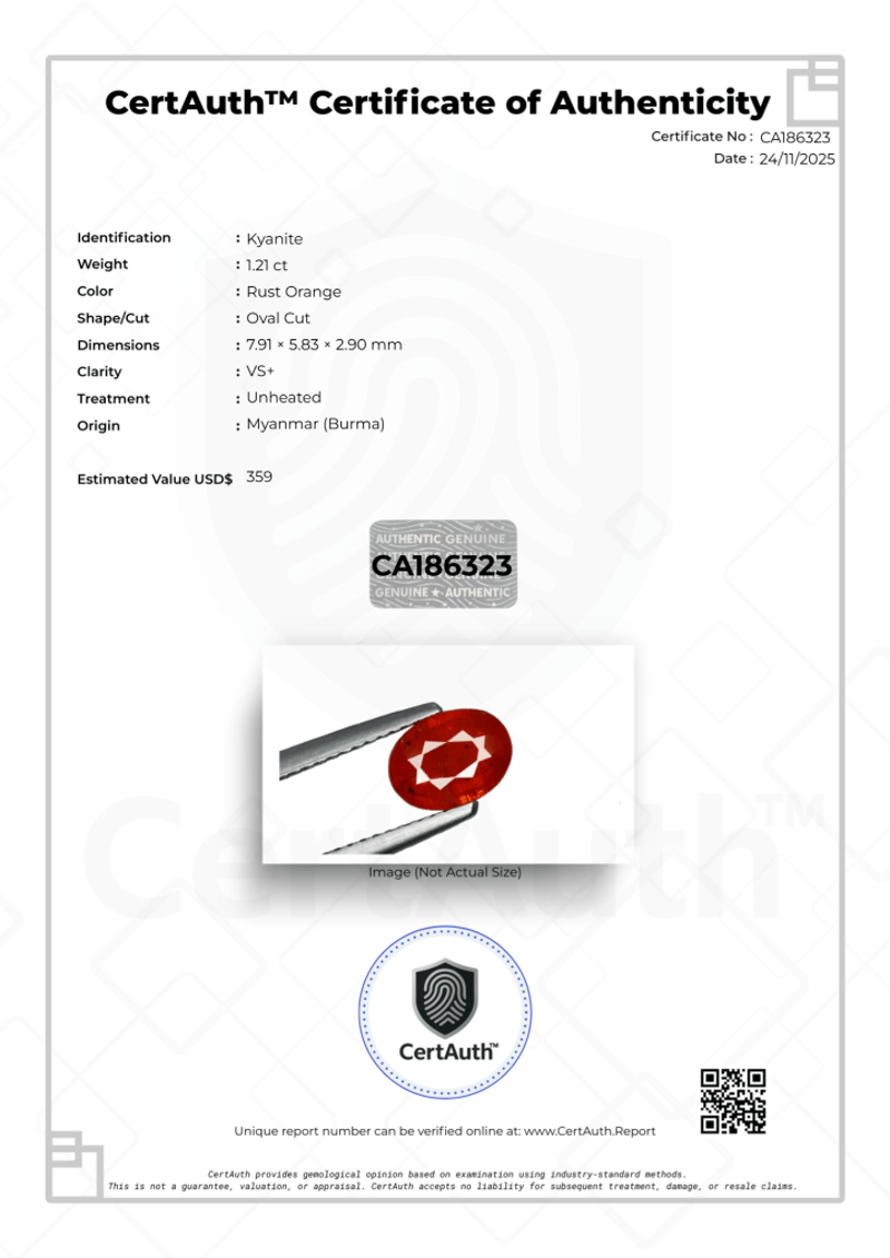 NATURAL 1.21CT RUST ORANGE KYANITE OVAL CUT UNHEATED MYANMAR WITH CERTAUTH DIGITAL CERTIFICATE This Natural Kyanite Displays A Rust Orange Colour And Is Fashioned Into An Oval Cut. With A Weight Of 1.21 Ct And Vs+ Clarity, This Earth-Mined Gemstone Is Unheated. This Listing Includes A Certauth Digital Certificate Of Authenticity For Secure Online Verification.• Gemstone: Kyanite• Carat Weight: 1.21 Ct• Colour: Rust Orange• Cut: Oval Cut• Clarity: Vs+• Treatment: Unheated• Dimensions: 7.91 × 5.83 × 2.90 Mm• Origin: Myanmar (Burma)• Certification: Certauth Digital Certificate (Ca186323)• Estimated Value: $359 Usd Condition: Good - Refer Images 0488473+26