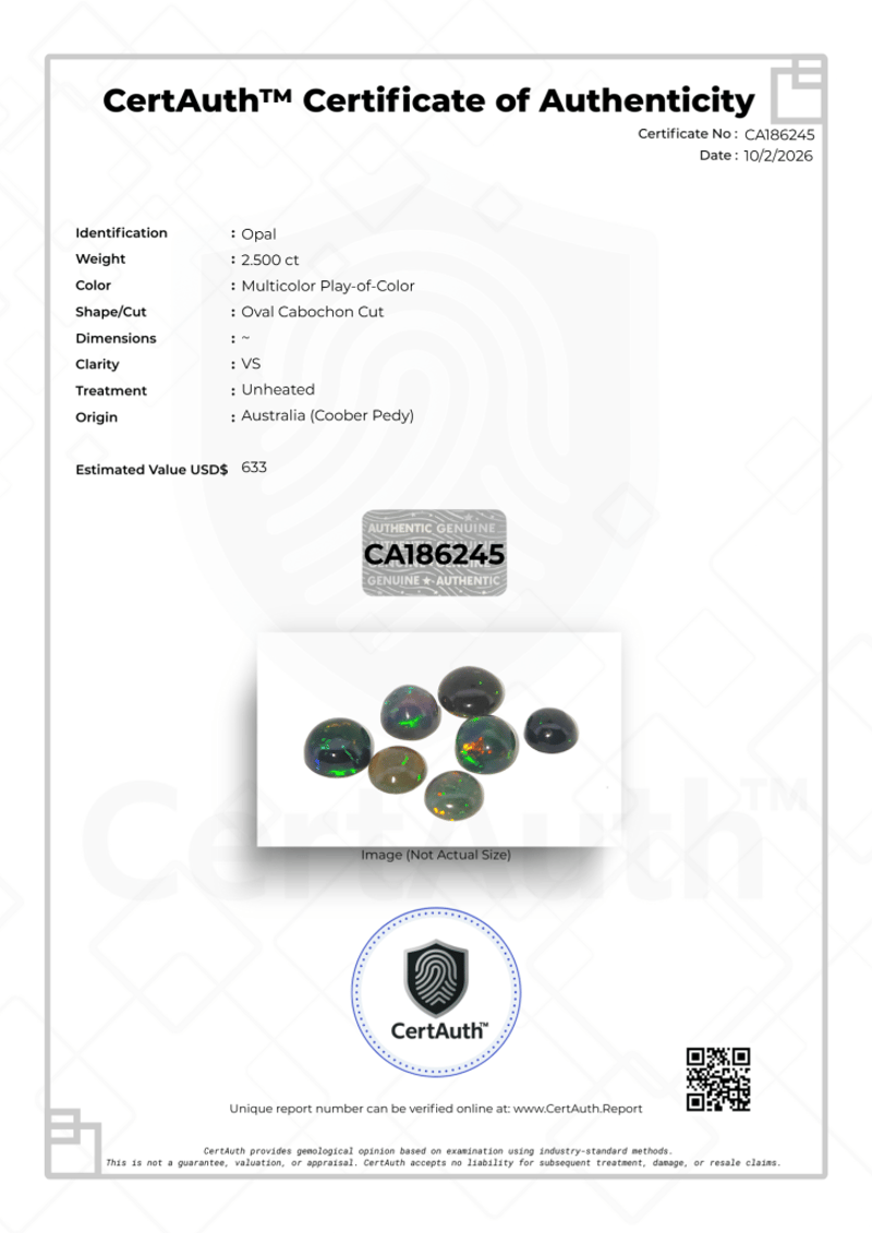 NATURAL 2.50CT MULTICOLOR PLAY-OF-COLOR OPAL OVAL CABOCHON CUT UNHEATED COOBER PEDY WITH CERTAUTH DIGITAL CERTIFICATE This Natural Opal Displays A Multicolor Play-Of-Color And Is Fashioned Into An Oval Cabochon Cut. With A Weight Of 2.50 Ct And Vs Clarity, This Earth-Mined Gemstone Is Unheated. This Listing Includes A Certauth Digital Certificate Of Authenticity For Secure Online Verification.• Gemstone: Opal• Carat Weight: 2.50 Ct• Colour: Multicolor Play-Of-Color• Cut: Oval Cabochon Cut• Clarity: Vs• Treatment: Unheated• Dimensions: ~• Origin: Australia (Coober Pedy)• Certification: Certauth Digital Certificate (Ca186245)• Estimated Value: $633 Usd Condition: Good - Refer Images 0488473+27