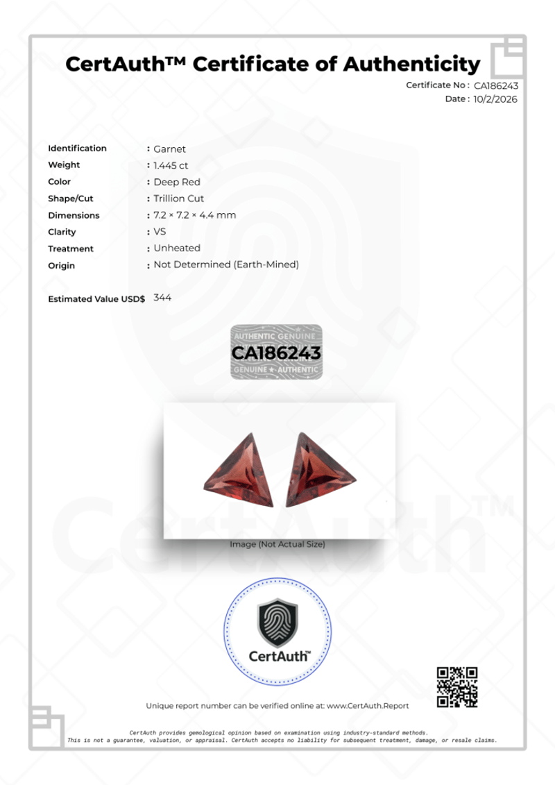 NATURAL 1.445CT DEEP RED GARNET TRILLION CUT UNHEATED WITH CERTAUTH DIGITAL CERTIFICATE This Natural Garnet Displays A Deep Red Colour And Is Fashioned Into A Trillion Cut. With A Weight Of 1.445 Ct And Vs Clarity, This Earth-Mined Gemstone Is Unheated. This Listing Includes A Certauth Digital Certificate Of Authenticity For Secure Online Verification.• Gemstone: Garnet• Carat Weight: 1.445 Ct• Colour: Deep Red• Cut: Trillion Cut• Clarity: Vs• Treatment: Unheated• Dimensions: 7.2 × 7.2 × 4.4 Mm• Origin: Not Determined (Earth-Mined)• Certification: Certauth Digital Certificate (Ca186243)• Estimated Value: $344 Usd Condition: Good - Refer Images 0488473+28