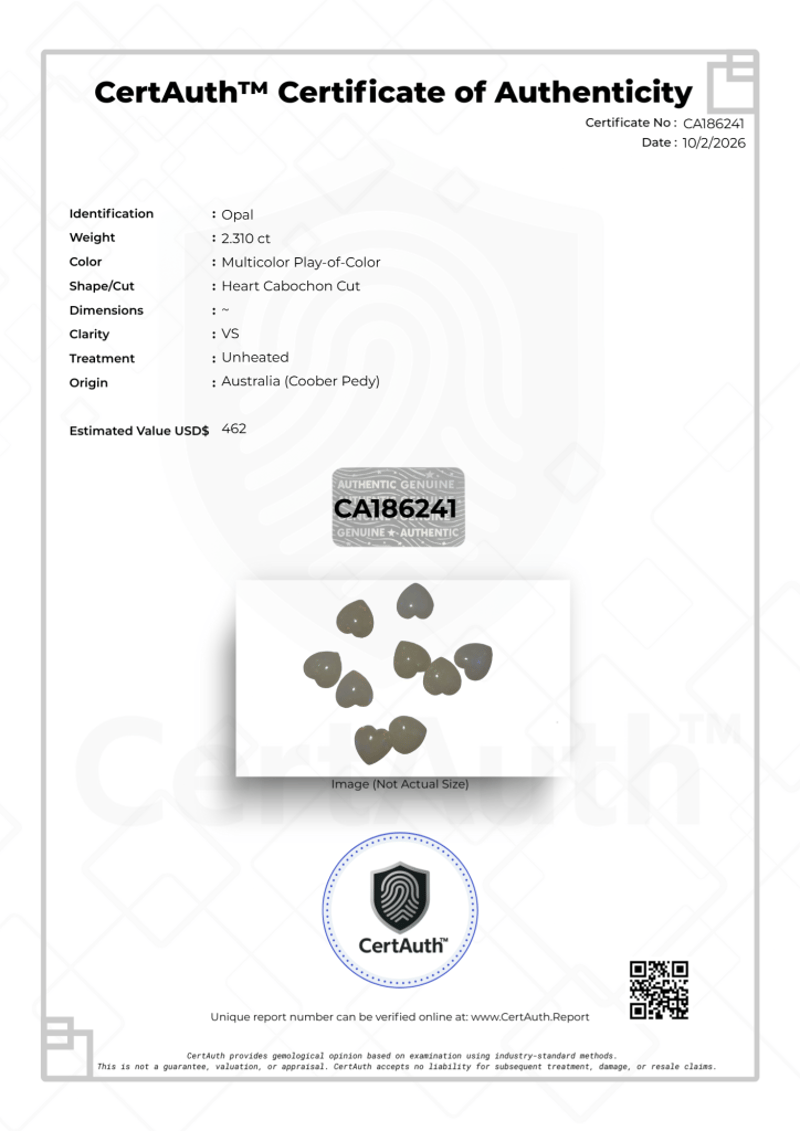 NATURAL 2.310CT MULTICOLOR PLAY-OF-COLOR OPAL HEART CABOCHON CUT UNHEATED COOBER PEDY WITH CERTAUTH DIGITAL CERTIFICATE This Natural Opal Displays A Multicolor Play-Of-Color And Is Fashioned Into A Heart Cabochon Cut. With A Weight Of 2.310 Ct And Vs Clarity, This Earth-Mined Gemstone Is Unheated. This Listing Includes A Certauth Digital Certificate Of Authenticity For Secure Online Verification.• Gemstone: Opal• Carat Weight: 2.310 Ct• Colour: Multicolor Play-Of-Color• Cut: Heart Cabochon Cut• Clarity: Vs• Treatment: Unheated• Dimensions: ~• Origin: Australia (Coober Pedy)• Certification: Certauth Digital Certificate (Ca186241)• Estimated Value: $462 Usd Condition: Good - Refer Images 0488473+30