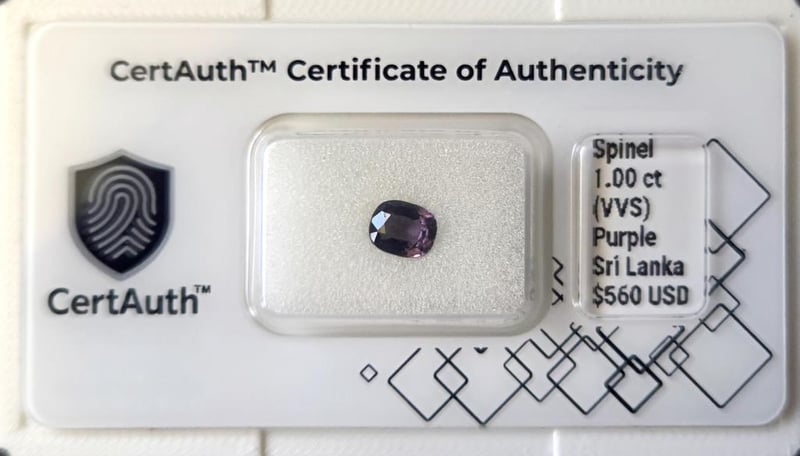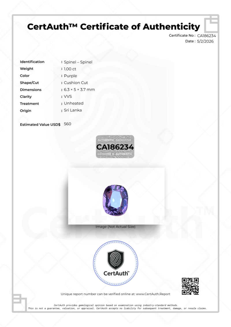 NATURAL 1.00CT PURPLE SPINEL CUSHION CUT UNHEATED SRI LANKA WITH CERTAUTH DIGITAL CERTIFICATE This Natural Spinel Displays A Purple Colour And Is Fashioned Into A Cushion Cut. With A Weight Of 1.00 Ct And Vvs Clarity, This Earth-Mined Gemstone Is Unheated. This Listing Includes A Certauth Digital Certificate Of Authenticity For Secure Online Verification.• Gemstone: Spinel• Carat Weight: 1.00 Ct• Colour: Purple• Cut: Cushion Cut• Clarity: Vvs• Treatment: Unheated• Dimensions: 6.3 × 5.0 × 3.7 Mm• Origin: Sri Lanka• Certification: Certauth Digital Certificate (Ca186234)• Estimated Value: $560 Usd Condition: Good - Refer Images 0488473+37