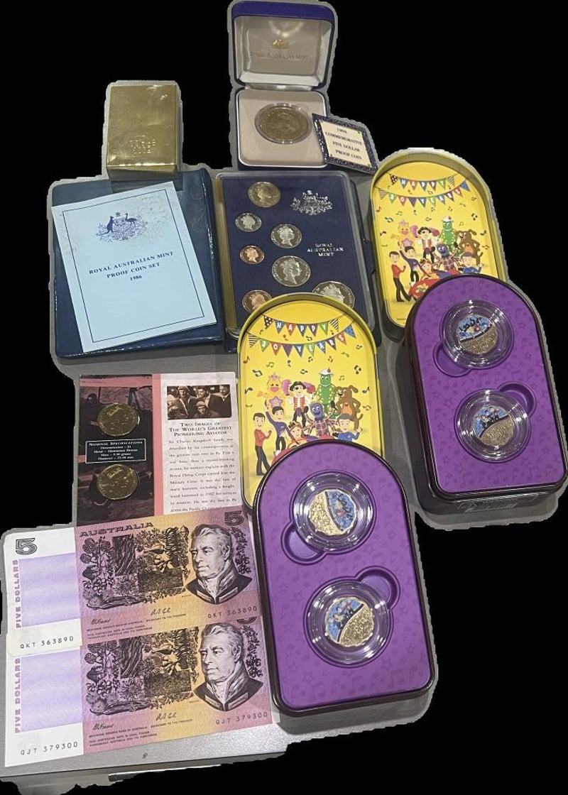 BULK LOTS: 2021 AUSTRALIA WIGGLES COIN SET X 2 / BRASS 500 GRAM BAR/ 1982 ROYAL AUSTRALIAN MINT 7 COINS PROOF SET / 1997 SIR KINGFORD SMITH $1- 2 COIN SET/1994 FIVE DOLLAR WOMEN ENFRANCHISEMENT PROOF COIN/AUSTRALIA $5 DOLLAR BANK NOTE X 2 HIGH VALUE LOTS 311171+28