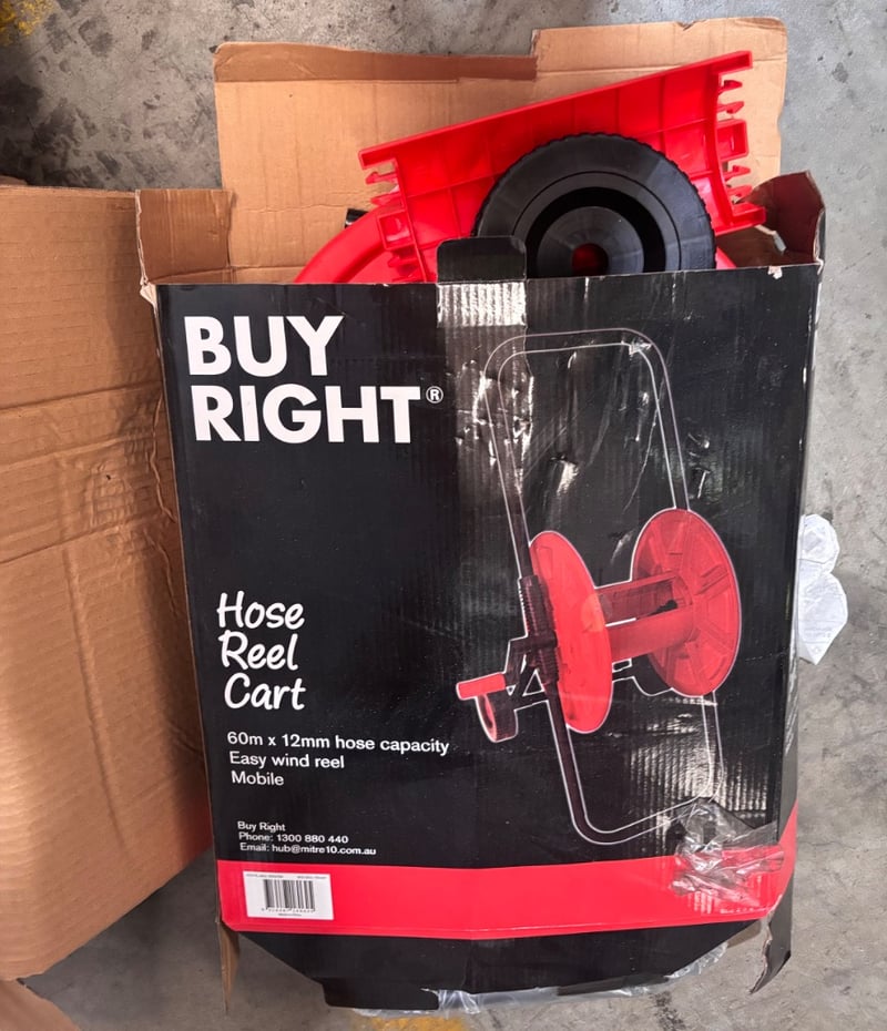 Assorted lot including hose reel cart, hand saw, plastic containersNote; Sold as lot, items may be damaged.