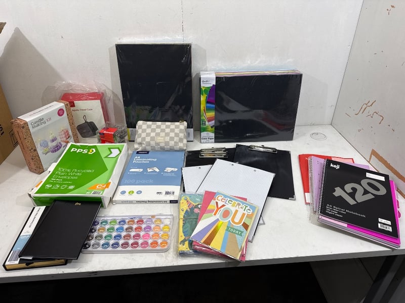 Office Supplies, Assorted brands including J.Burrows, Disney, Quill etc. Items include Paper Clips, Pencil Case, Paper, Paint, Cards, Envelopes etc. Quantity to box, sold as lot.