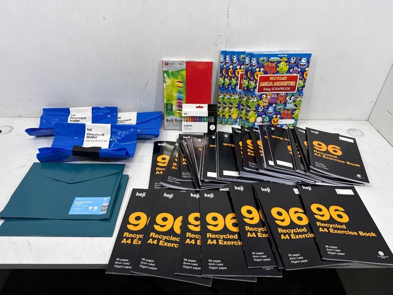 Office Supplies, Assorted Brands including Quill, J.Burrows, Studymate, Keji etc. Items include Document Wallet, Exercise Books, Quill Board, Crayons etc. Quantity- 2 boxes, sold as lot.