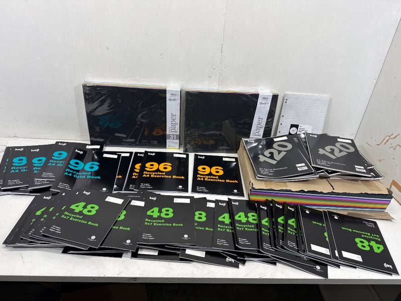 Office Supplies, Assorted Brands including Keji and Quill. Items including A4 Grid Book, A4 Exercise Book, 9X7 Exercise Book, A4 Spiral Notebook, Thick Paper. Quantity- box sold as lot.