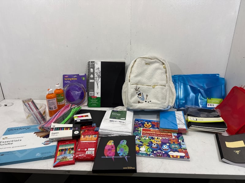 Office Supplies/ Art Supplies, Assorted Brands including Glow Forge, Faber-Castell, Studymate, Derwent, Kadina, J.Burrows etc. Items include Disney Backpack, Pencils, Crayons, Paint, Work Books, Carry Bags, Sorting Bowls etc. Quantity- Box sold as lot.