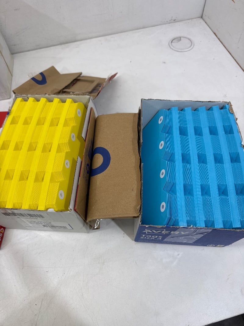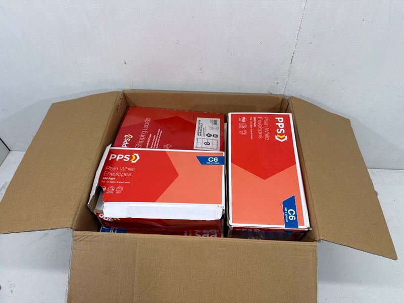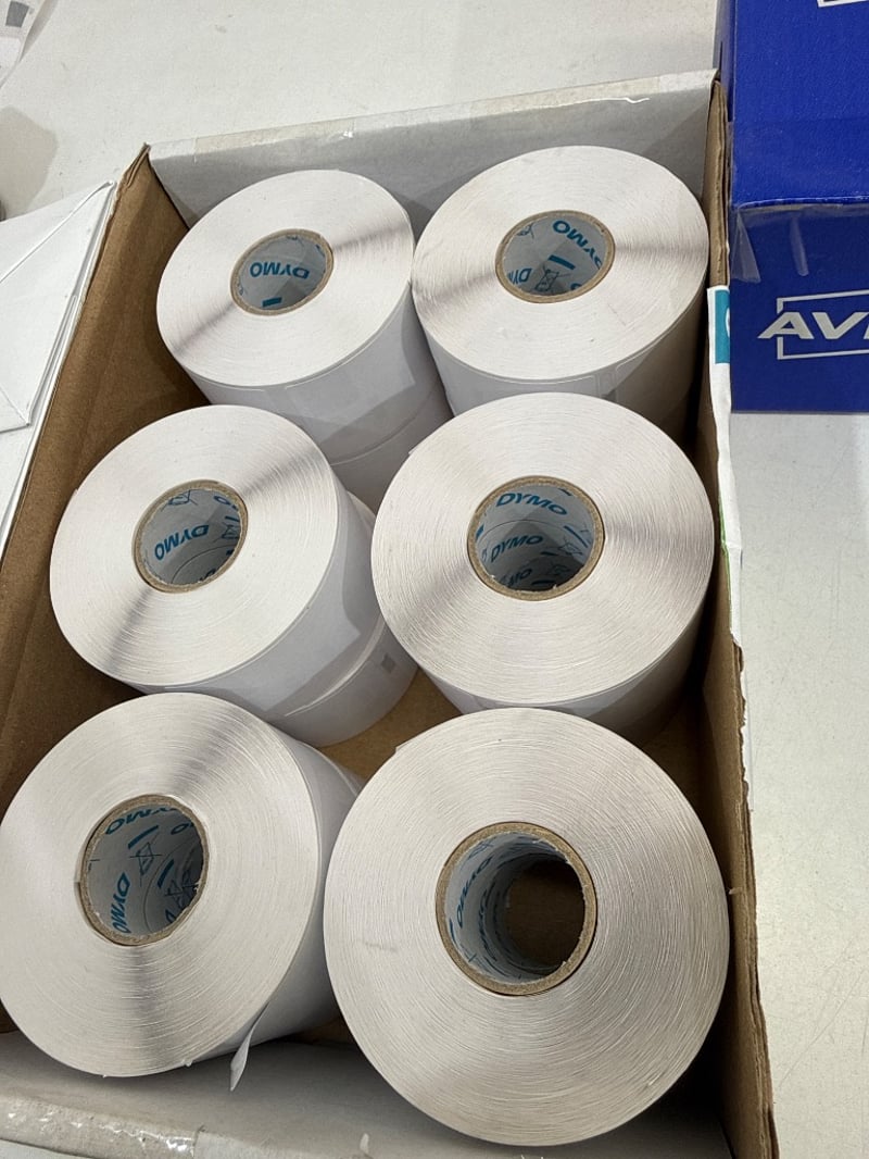 Office Supplies, Assorted Brands including Avery, Dymo, PPS, J.Burrows, MBG etc. Items include labels, Thermal Rolls, Shipping Labels, Envelopes, Tags etc. Quantity- Box sold as lot.