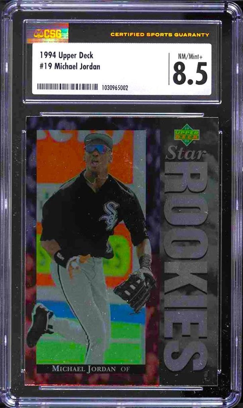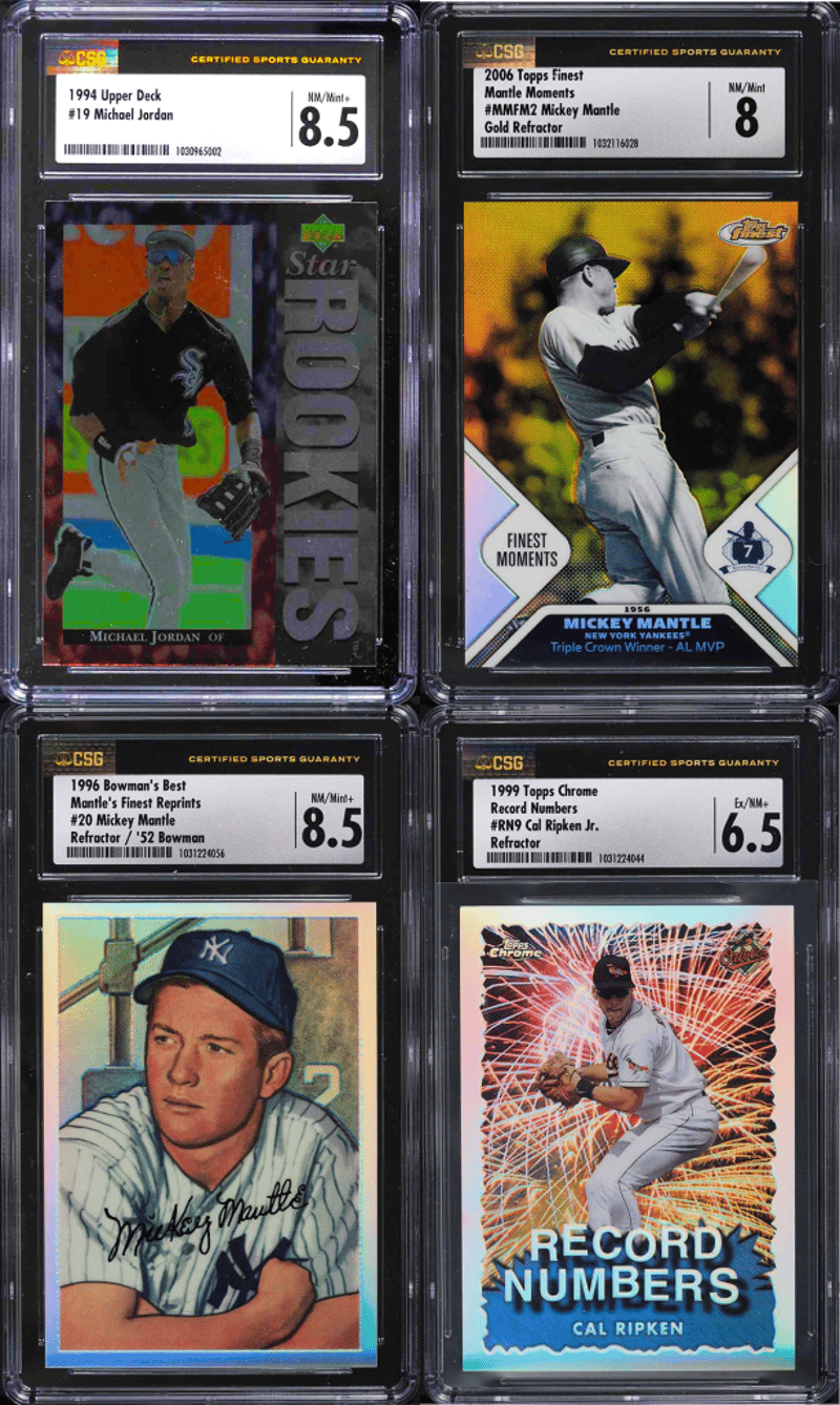 PREMIUM 4-CARD LOT – REFRACTORS OF BASEBALL ROYALTY & MICHAEL JORDAN BASEBALL ROOKIE CARD This Is A Tightly Held, High-Impact Three Card Graded Refractor Lot Featuring Two Of The Most Recognised And Enduring Names In Baseball History. Premium Chromium Technology, Limited Serial Numbering, And Established Grading Combine To Deliver A Lot With Genuine Collector Weight. Adding To The Three Epic All-Time Baseball Greats Is The One And Only Michael Jordan In His Rookie Season With The Chicago White Sox - Yes! A Graded Nm/Mt+ Mj Rookie Card! All Three Cards Are Professionally Graded By Csg And Are Offered Strictly As One Complete Lot. The Complete Lot – Sold As One - 1996 Bowman'S Best Mantle’S Finest Reprints ’52 Refractor Mickey Mantle, Csg 8.5 Nm-Mt+ - 2006 Finest Moments Gold Refractor Mickey Mantle /49 #Mmfm2, Csg 8 Nm-Mt - 1999 Topps Chrome Record Numbers Refractor Cal Ripken Jr. #Rn9, Csg 6.5 Exmt+ - 1994 Upper Deck Star Rookies Michael Jordan #19, Csg 8.5 Nm-Mt+ Why This Lot Stands Out - Features Legendary Hall Of Fame Icons Mickey Mantle And Cal Ripken Jr. - Includes A Serial-Numbered Gold Refractor Limited To Just 49 Copies Worldwide - Strong Eye Appeal Across Premium Chromium-Era Releases - Refractor Technology From The 1990S And Early 2000S, A Period Highly Regarded By Collectors - Professionally Graded And Slabbed For Authenticity And Long-Term Protection The 1996 Bowman'S Best ’52 Refractor Is Particularly Desirable, Referencing Mantle’S Iconic 1952 Issue Through Premium 1990S Refractor Technology. The 2006 Gold Refractor, Limited To Just 49, Provides True Scarcity. The Ripken Topps Chrome Refractor Adds Hall Of Fame Presence And Historic Achievement Appeal. Condition: Good - Refer To Images 584432+5