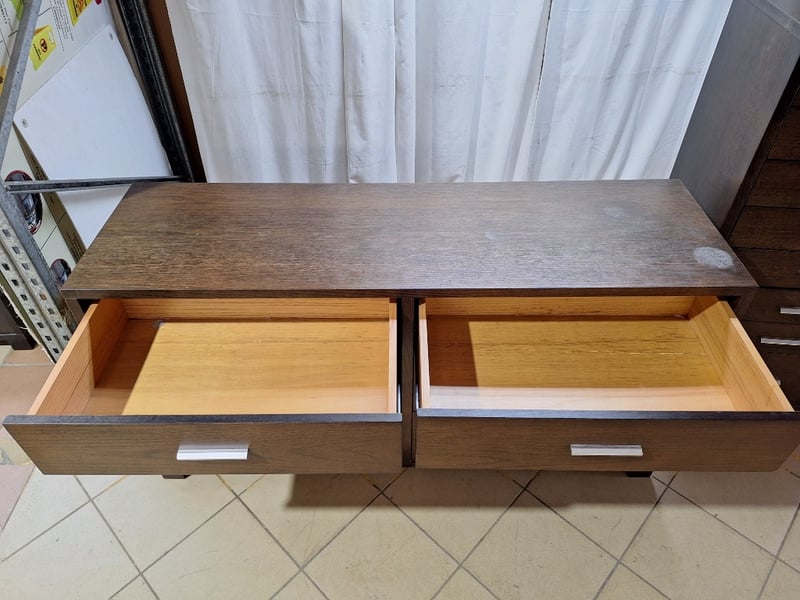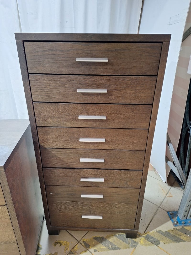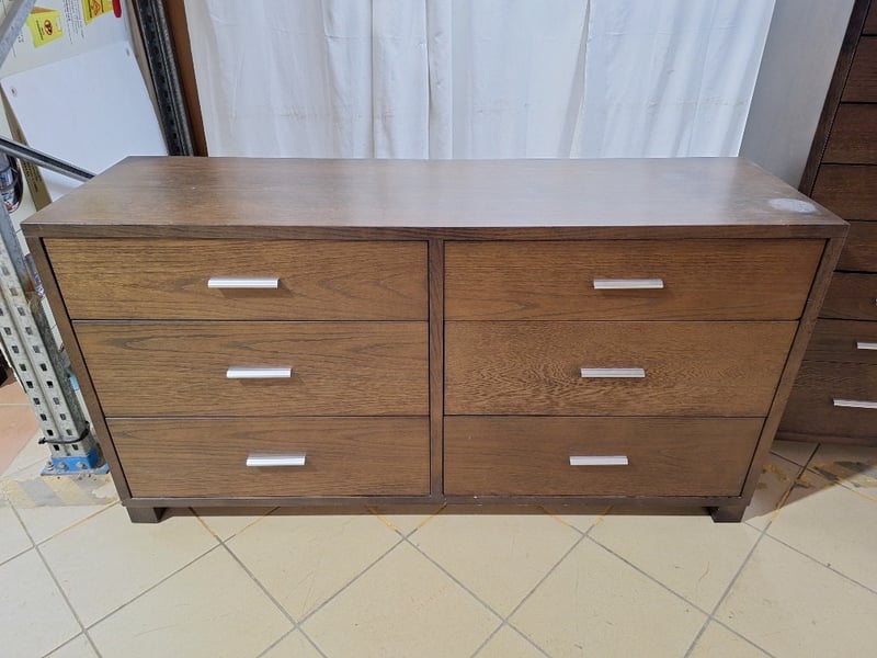 Dresser With Matching Tall Chest Of Drawers, Timber Style, Brown FinishDimensions Dresser H:76cm W:147cm D:44cmDimensions Drawers H:120cm W:59cm D:40cmSOLD AS LOT