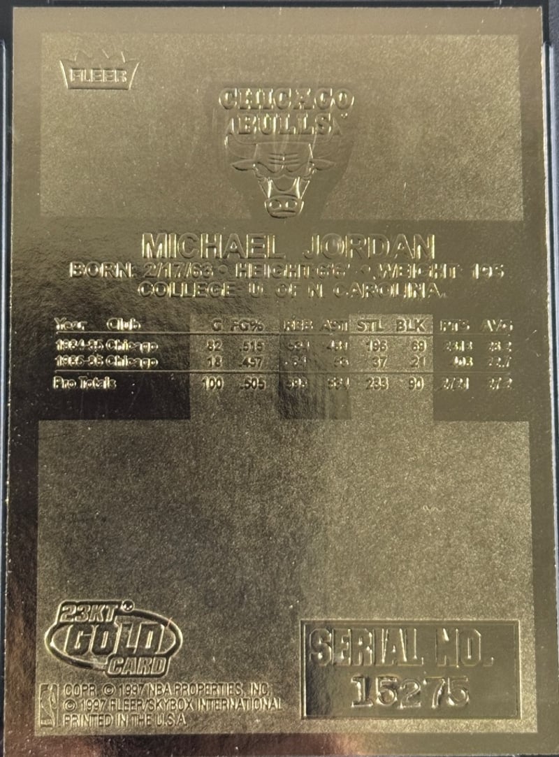 1998 FLEER 23KT GOLD MICHAEL JORDAN FLEER PREMIER COLLECTORS CARD "1986 ROOKIE"10 Gem-Mt From "World Class Grading"Condition: Good - Refer To Images9A586393+2