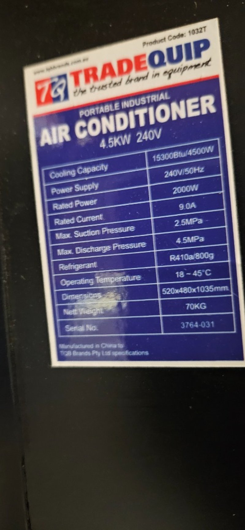 Air Conditioner TradeQuip 4.5KW 240v Note: Parts May be Missing