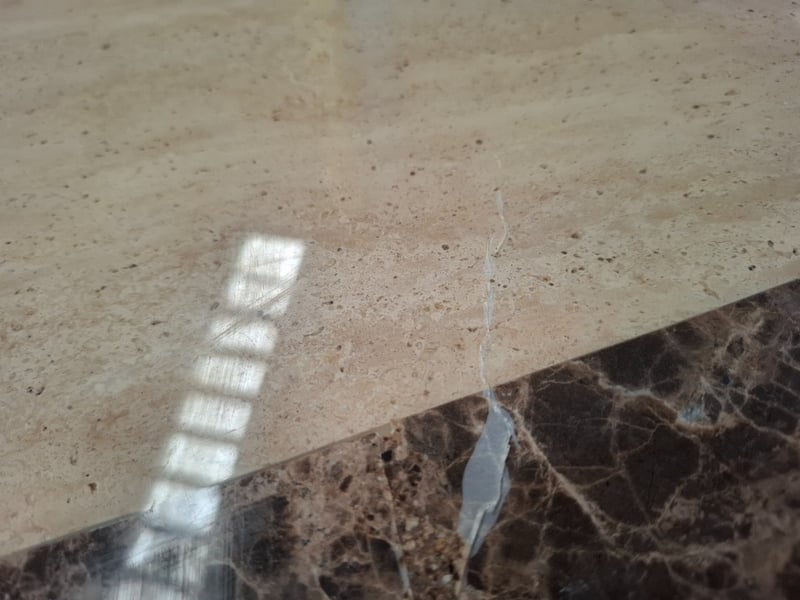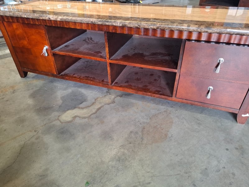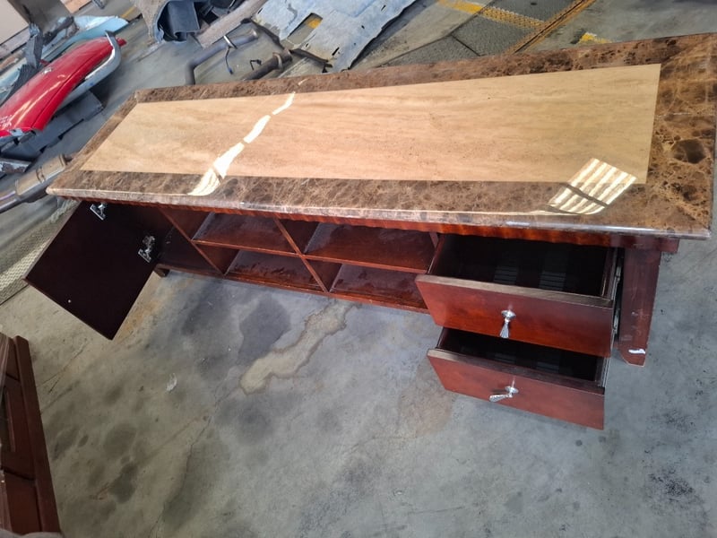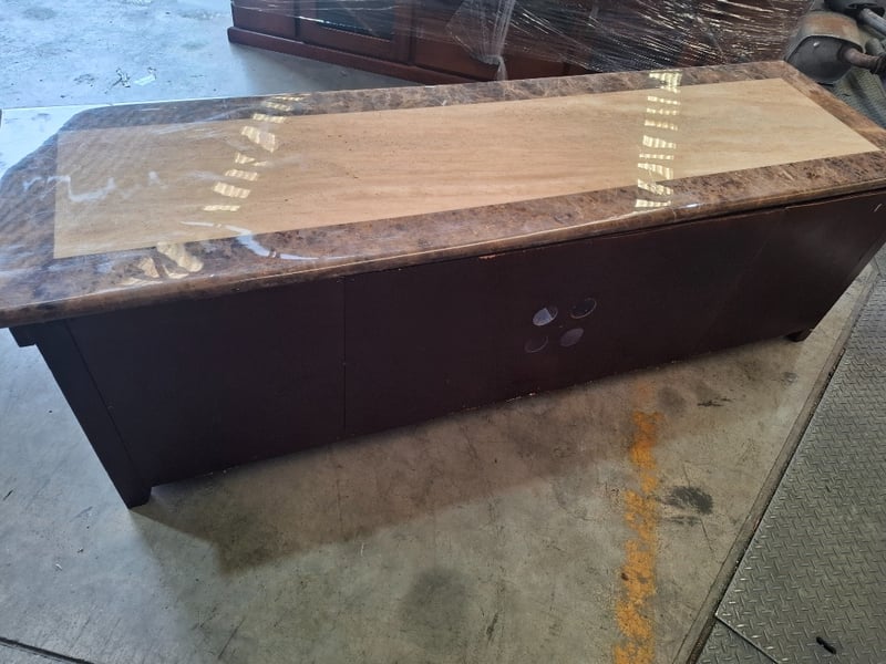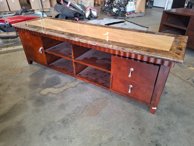 Stain timber , marble style top, 2 colors, old TV unit , 2 drawers, 1 doors, 4 tiers Dimensions: 190cm W x 55 cm D x 59 cm HNote: Scuffs and marks, wear and tear, cracks on top