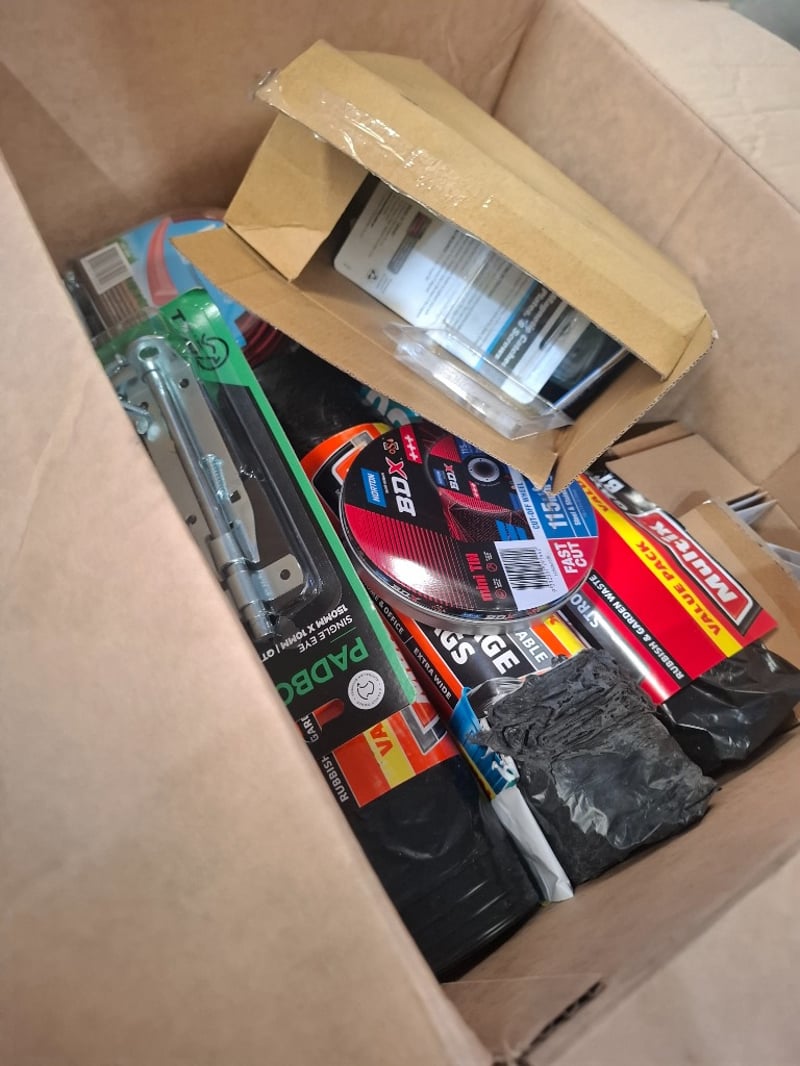 Assorted Hardware Items, Includes pad bolt, cut-off wheel 115mm, round trimer line ,garbage bags More Sold as lot