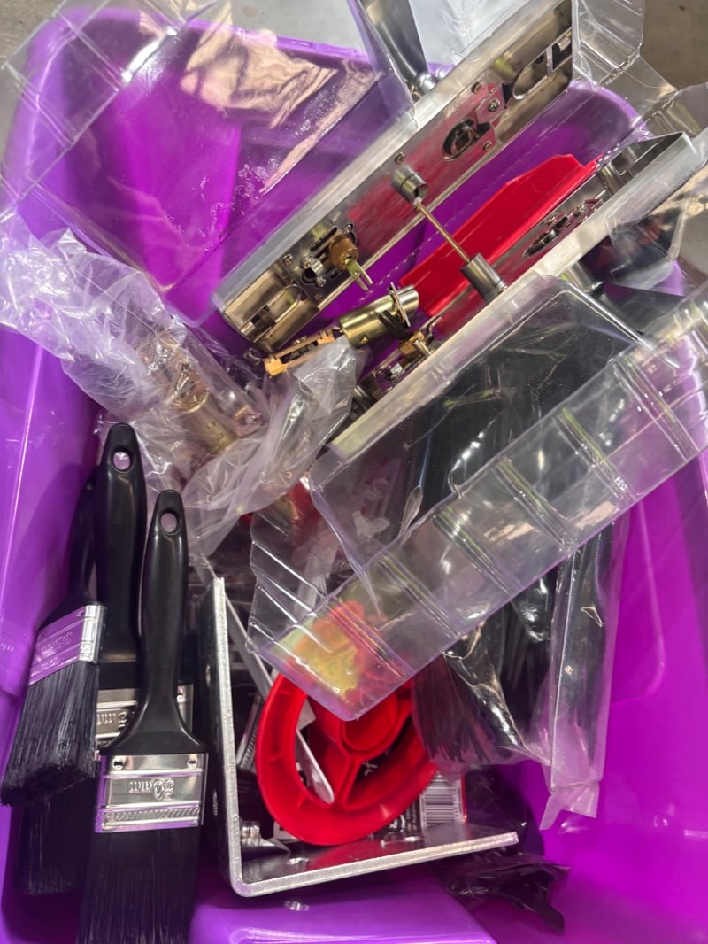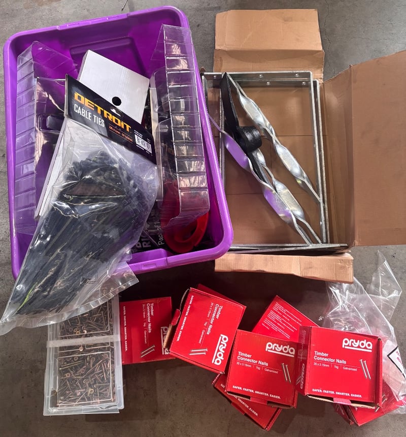 Assorted lot of building supplies, including nails, screws, paint brushes, zip ties, steel brackets.Note; sold in lot, items may be damaged(refer to images)