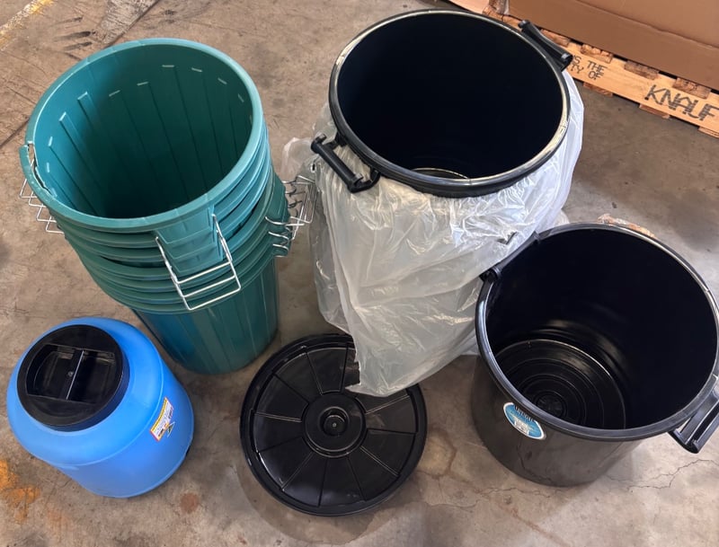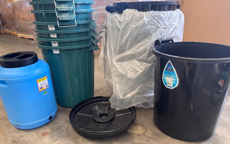Lot of plastic containers, plastic bins, 25L drum and bungNote; sold as lot, some cracks and chips