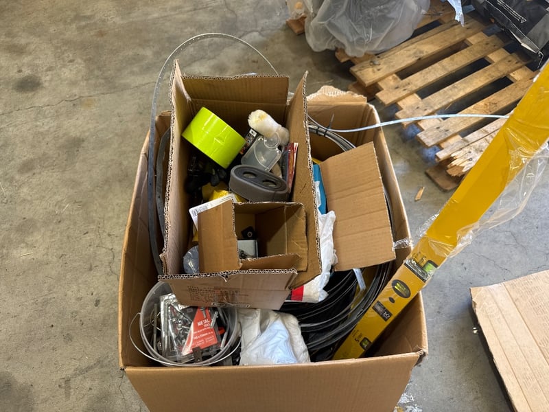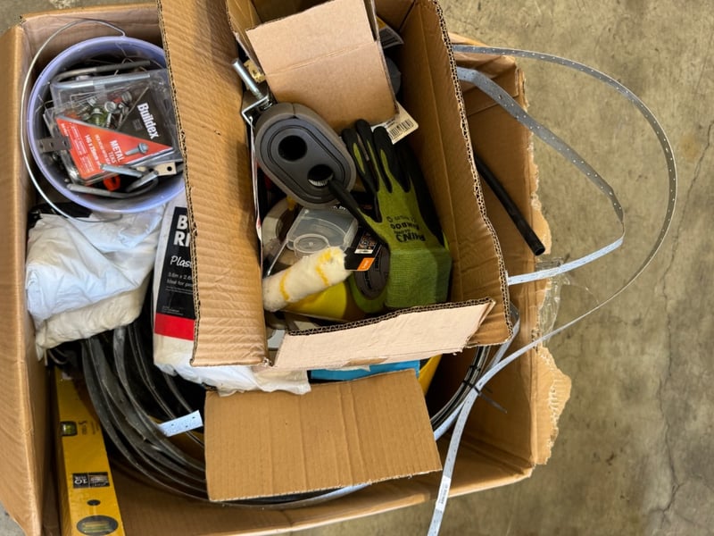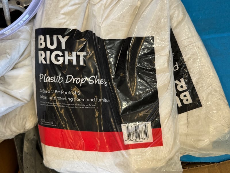 Assortment lot of homeware goods including plastic drip sheets, stabila,masking tape and moreNote: Sold as Lot, inspection recommended