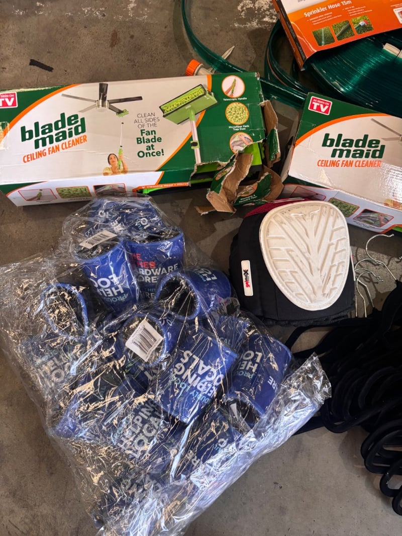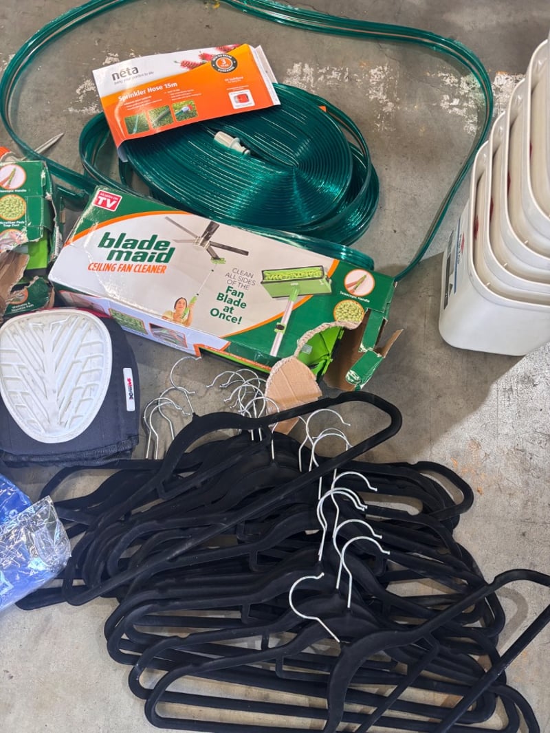 Assorted lot, Including clothe hangers, beer coolers, ceiling fan cleaner.Note; Sold as lot, some products are damaged (refer to images)