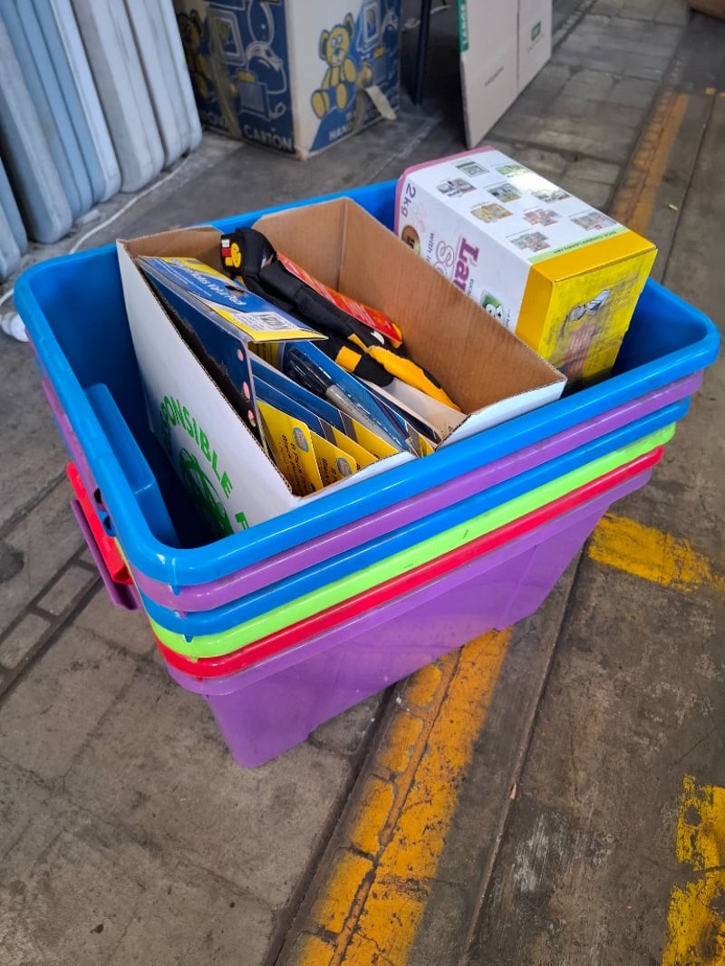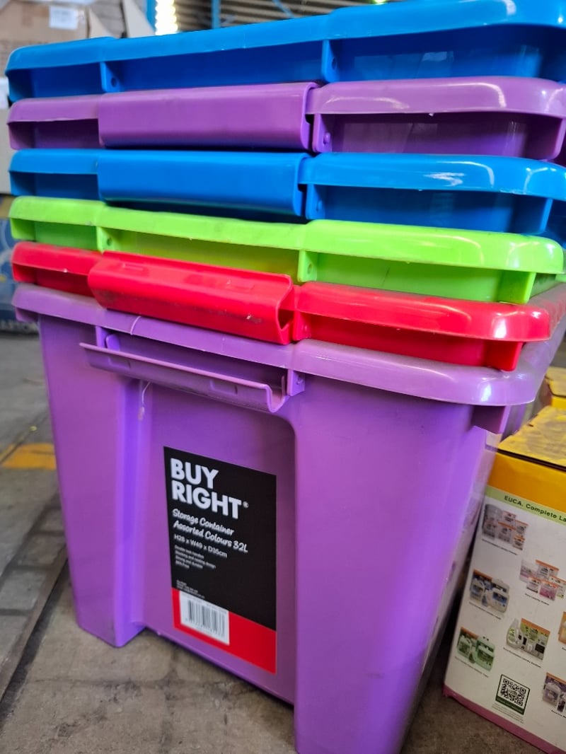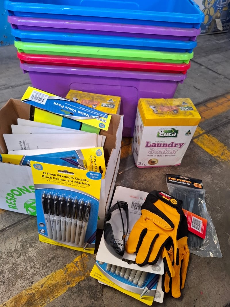 Assortment of 32 L plastic containers, Black permanent markers,safety equipment and more Sold as lot