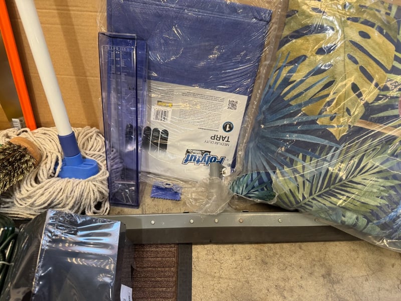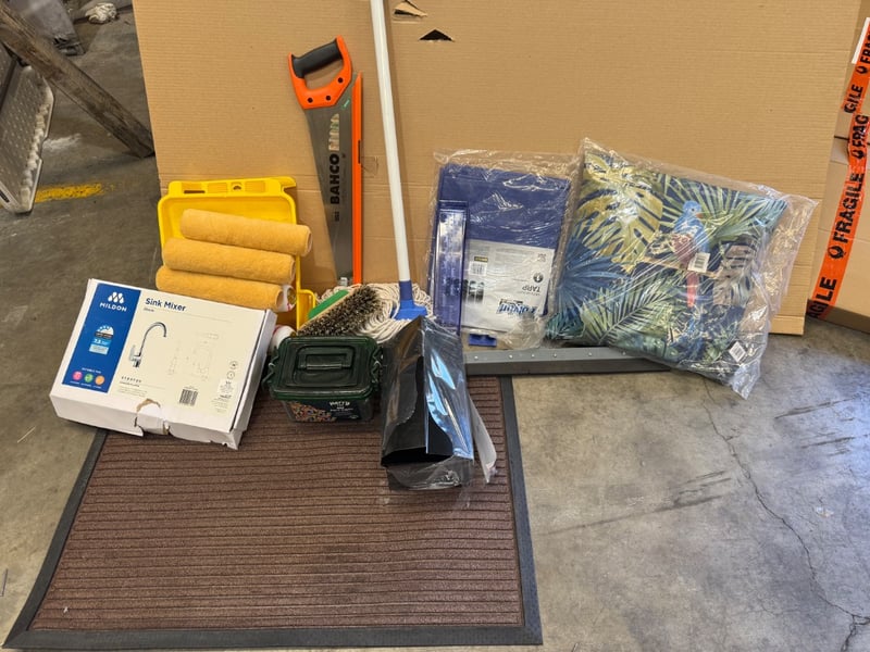 Assorted lot. Including hand saw, sink mixer, tarps, cushion, post letter boxNote; Sold as lot, Some items may have damage(refer to images)