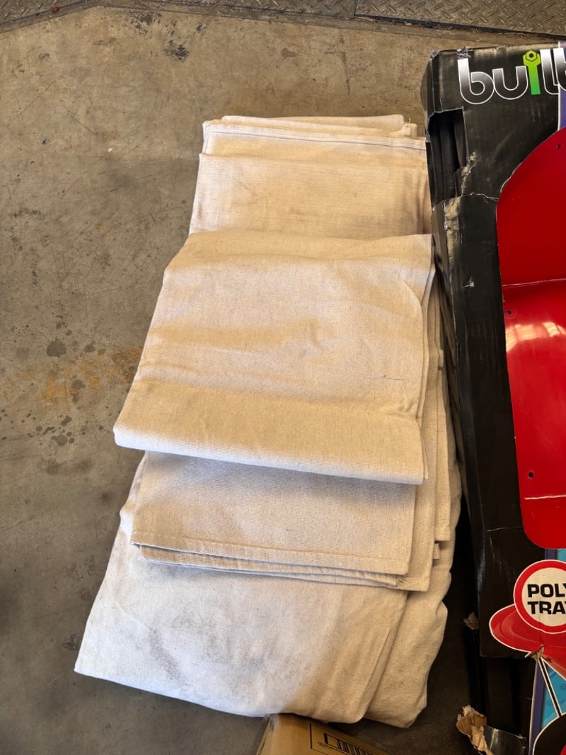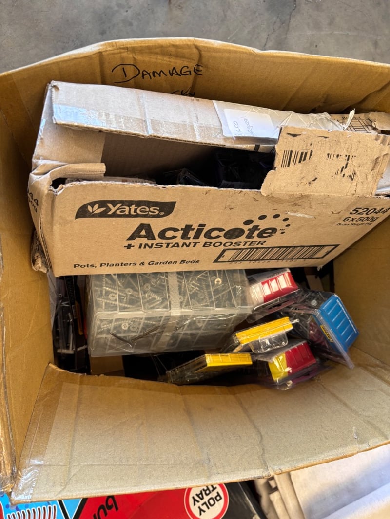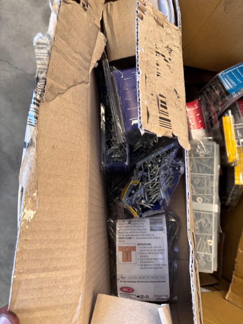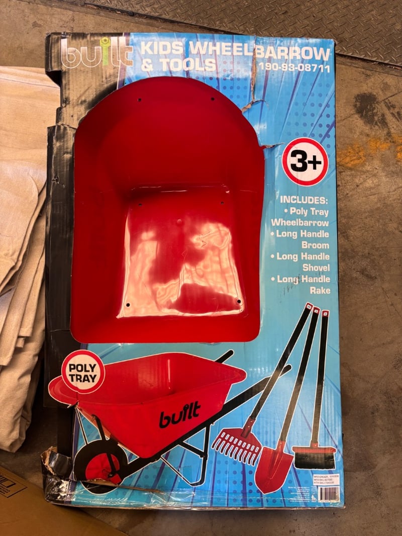 Assorted lot, including drop sheets, kids toy wheelbarrow, screws and nails Note; Sold as lot, items may be damaged(refer to images)