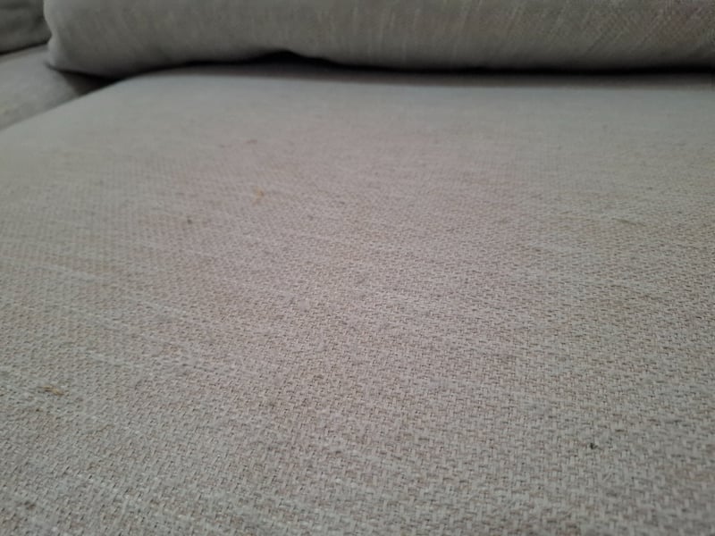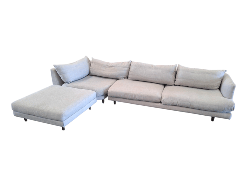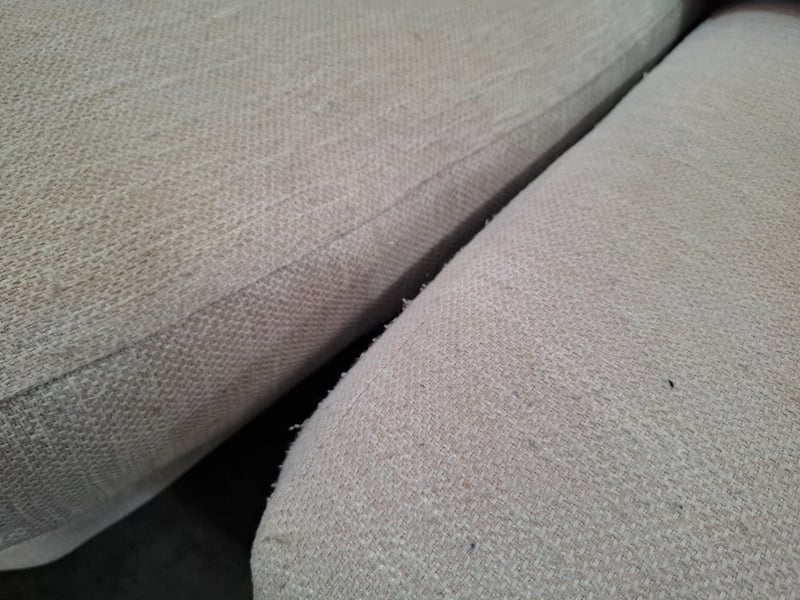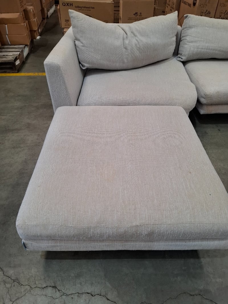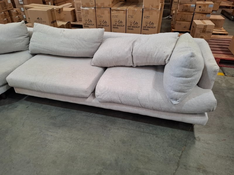 4 seater lounge, sand coloured fabric, dark brown timber legsDimensions: 310 cmW x 90cmD x 65cmHNote: wear and tear, scuff and marks , cleaning required