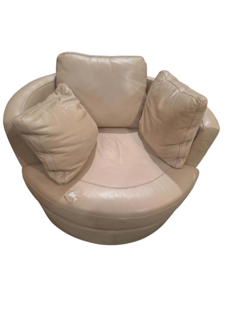 Swivel chair, beige leather Dimensions: 107cmW x 100cmD x 67cmHNote: Scuffs , cleaning required