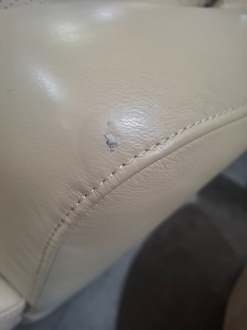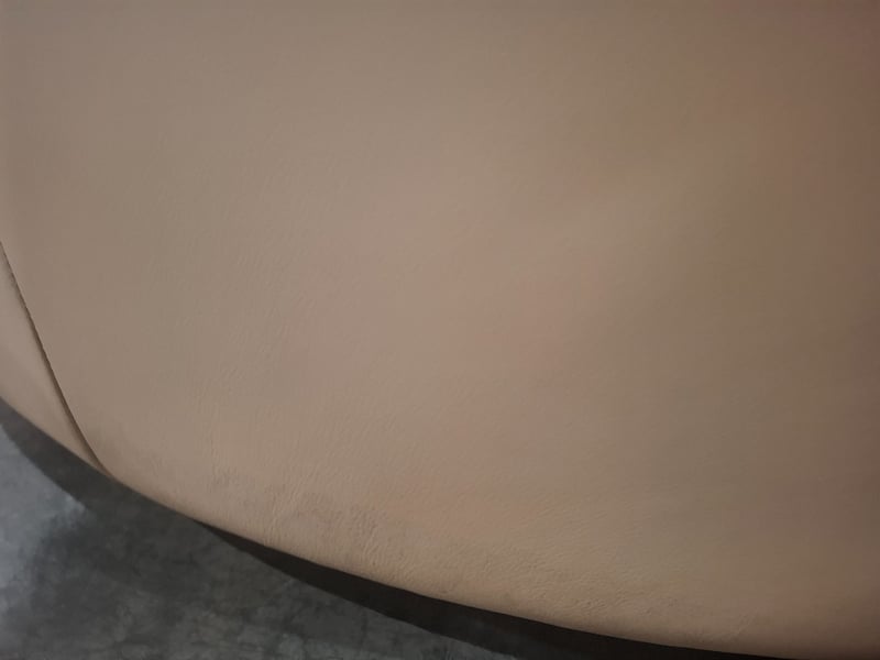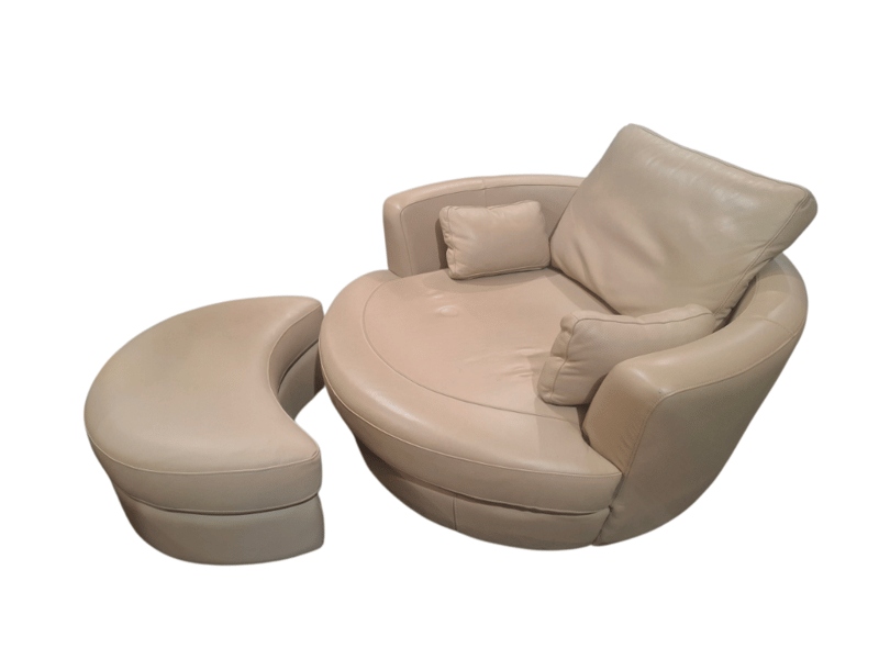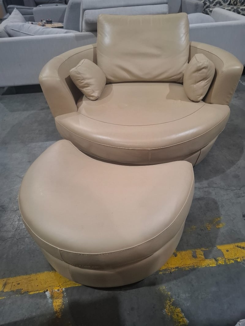 Swivel chair, ottoman beige leather Dimensions: 136cmW x 132cmD x 67cmHNote: minor cleaning required, minor Scuffs