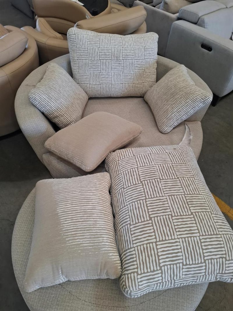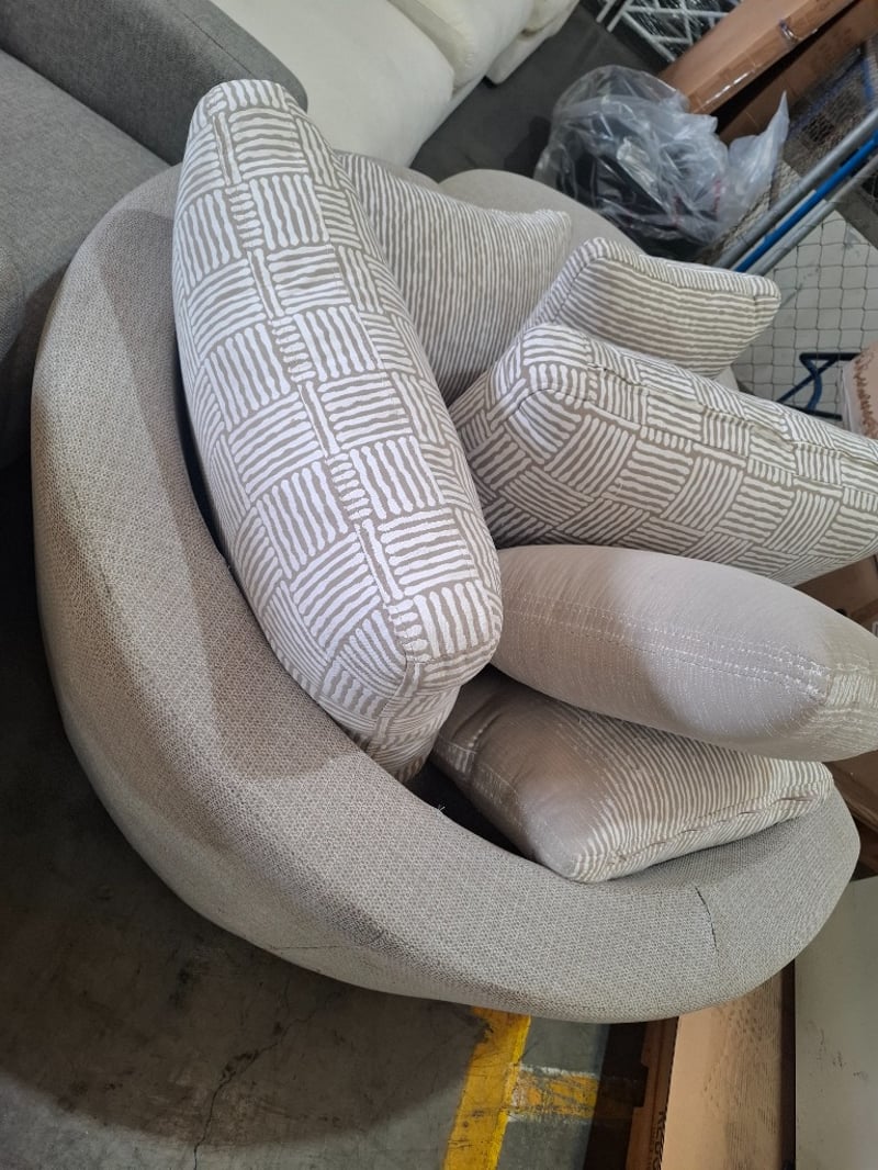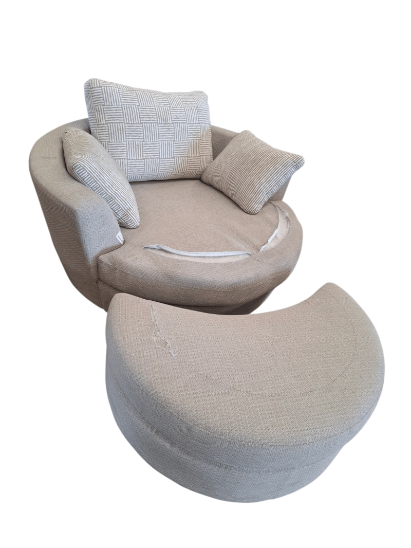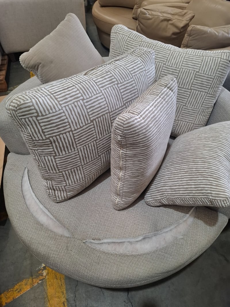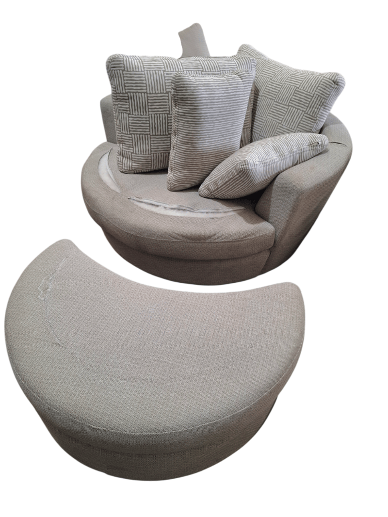 Swivel chair, ottoman grey fabric Dimensions: 136cmW x 132cmD x 67cmHNote:cleaning required, scuff and marks