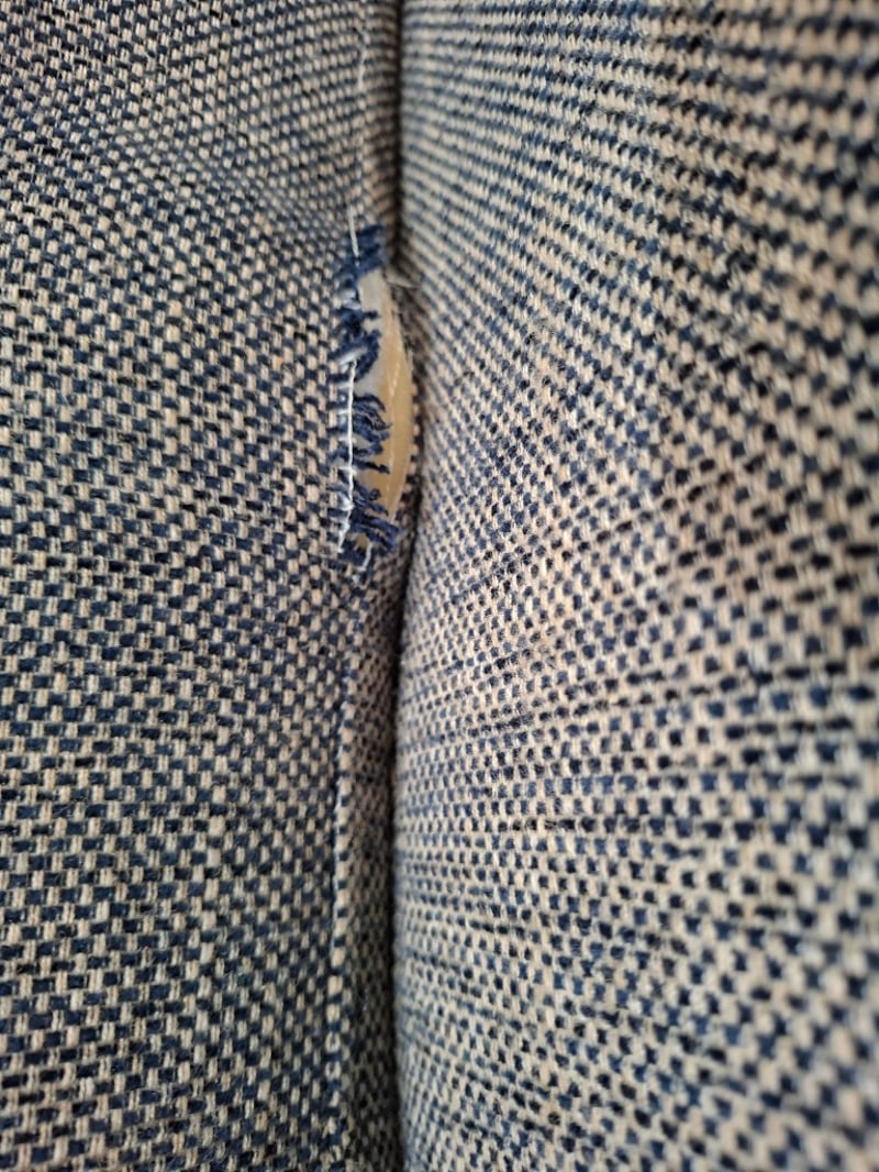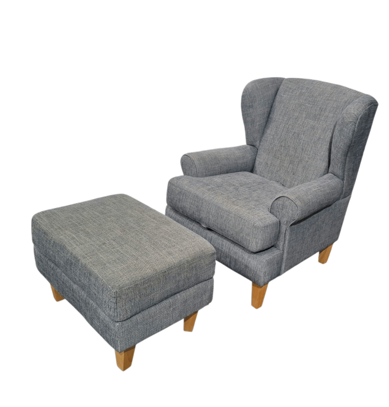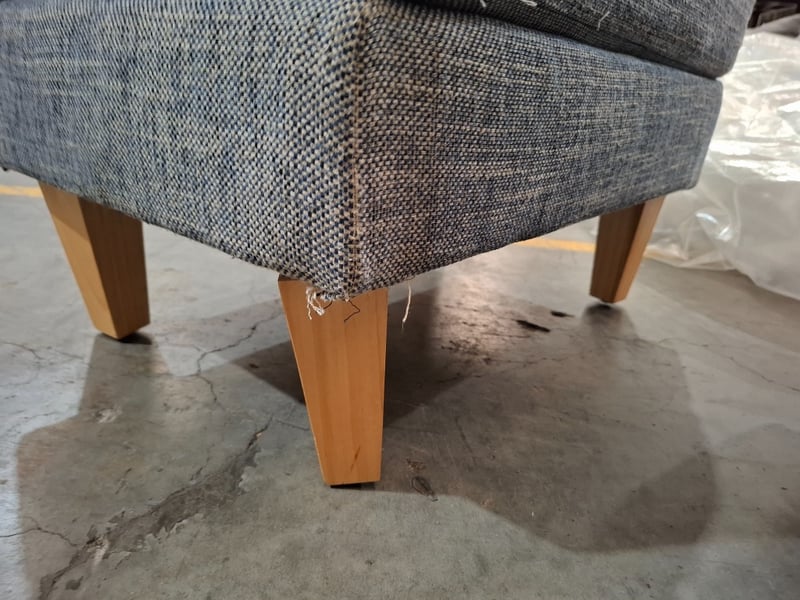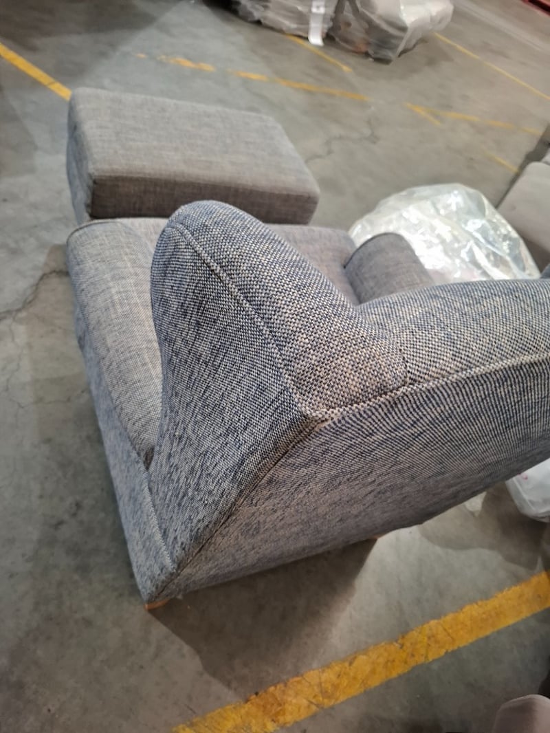 Fabric 1 seater sofa with matching foot restDimensions 92cmW 104cmD 104cmHNote : Wear and tear; stains on foot rest, rip at the back of chair ; cleaning required, legs are bent