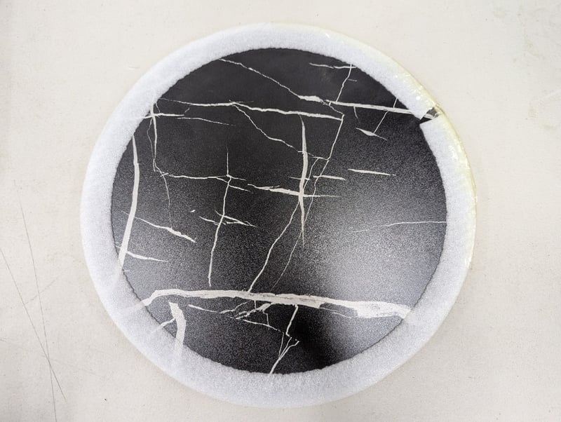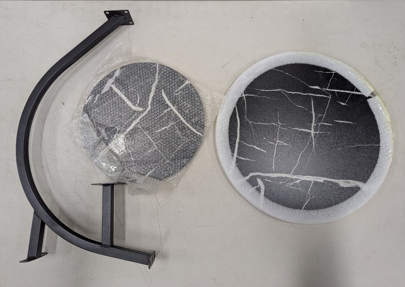 Two shelf mounted bracket, metal construction, round platform shelves, faux marble style design, bracket height: 60cm h x 30cm D, large shelf diameter: 40cm
