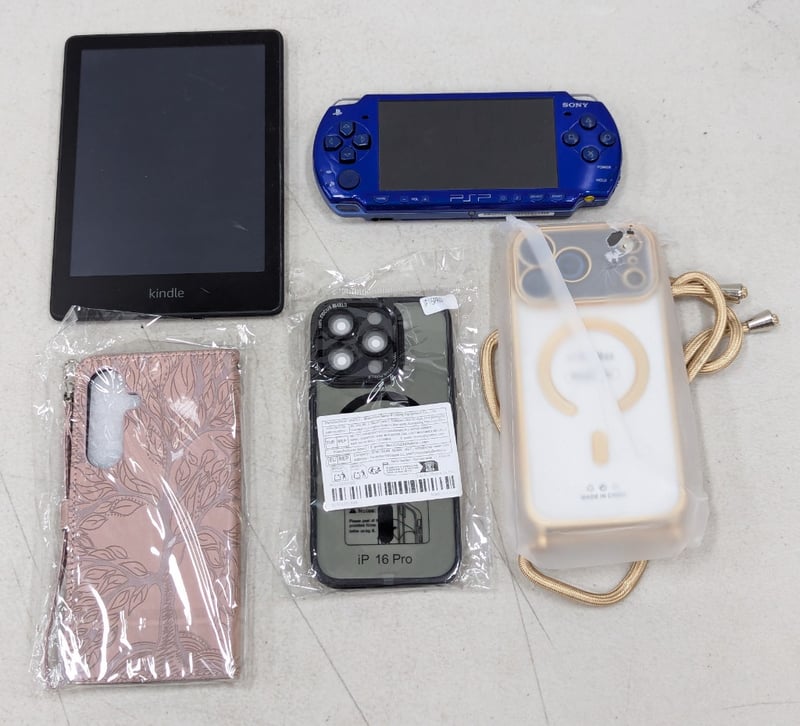 Kindle, Play Station Portable and three phone cases