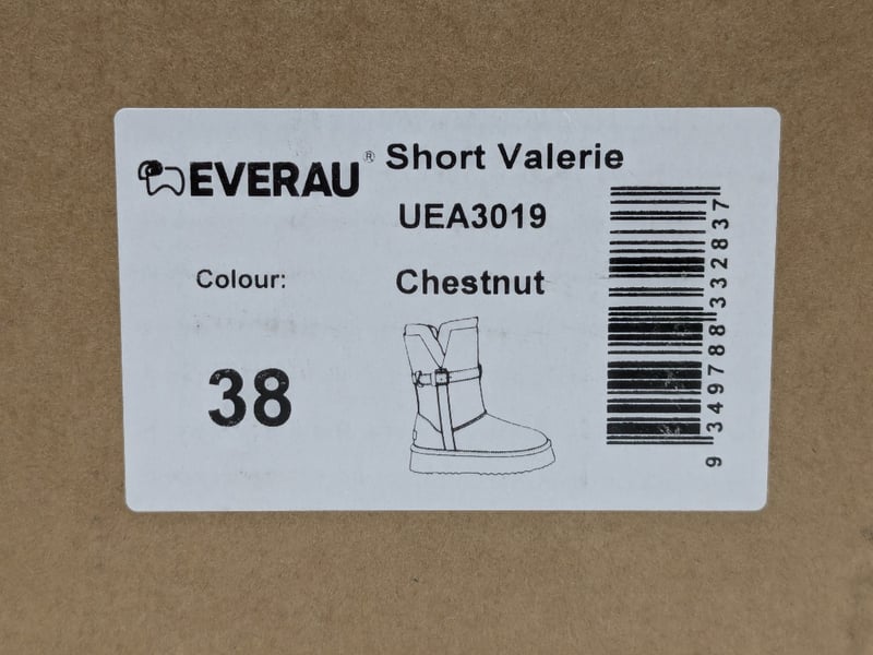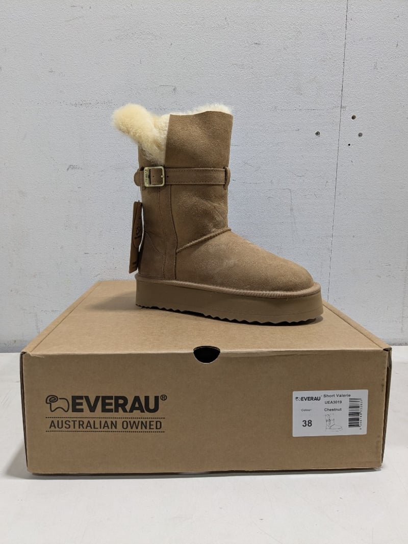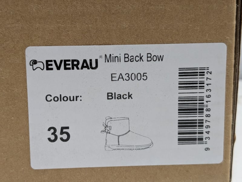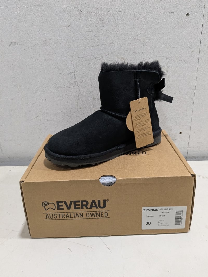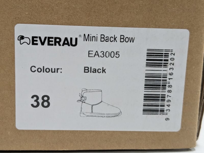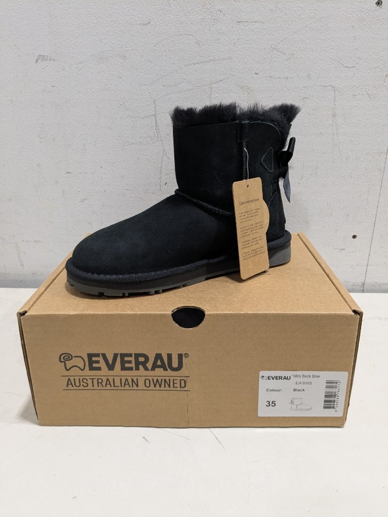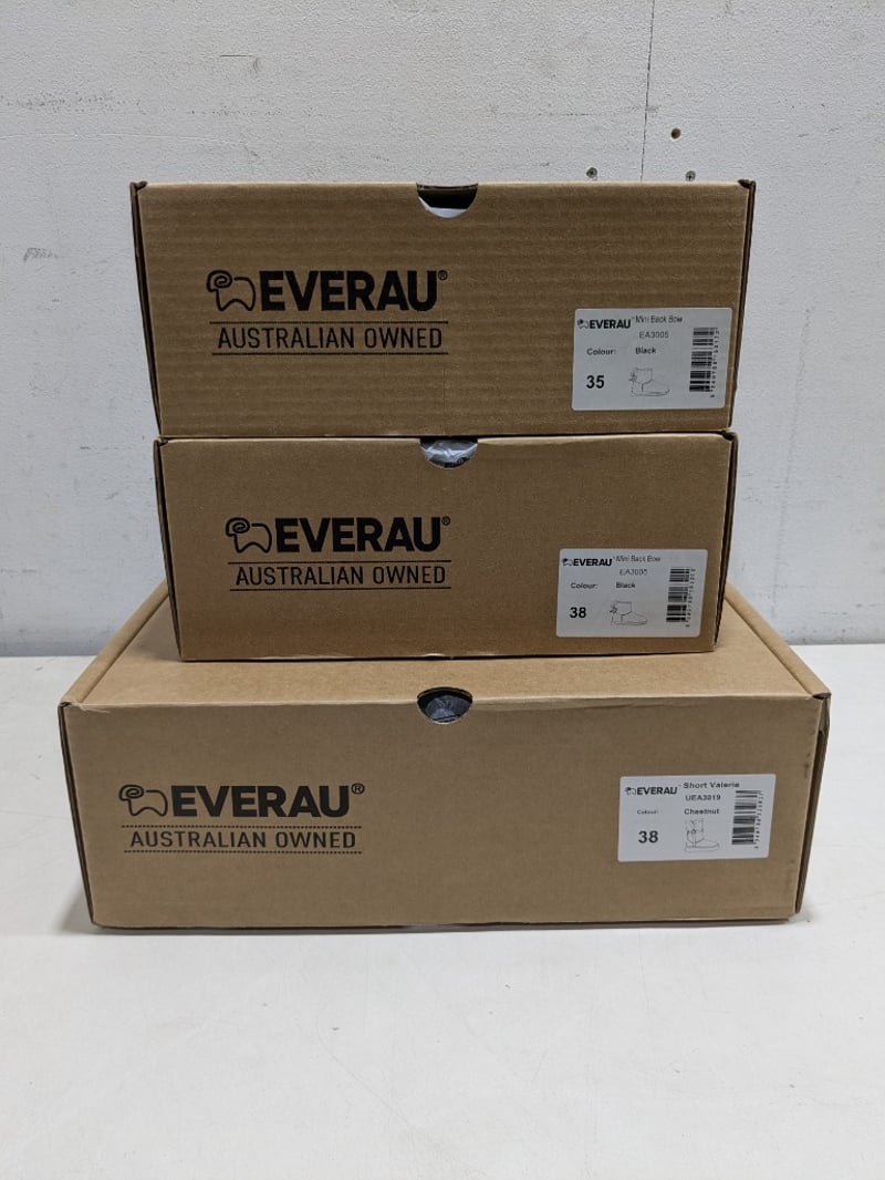 Collection of Everau Australian shoes different style and sizes including, Mini Black Bow #EA3005 and Short Valerie #UEA3019 Chestnut.