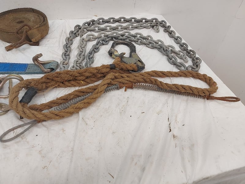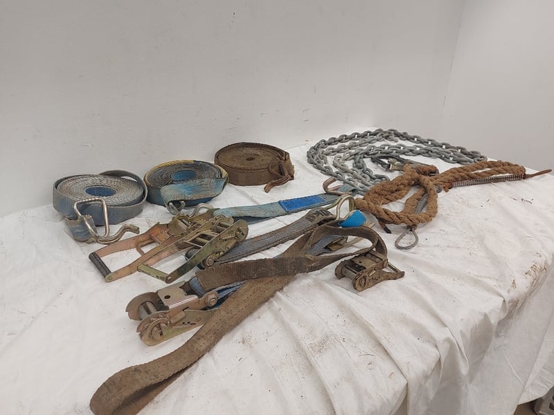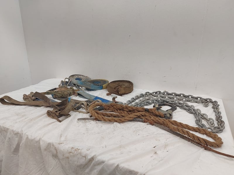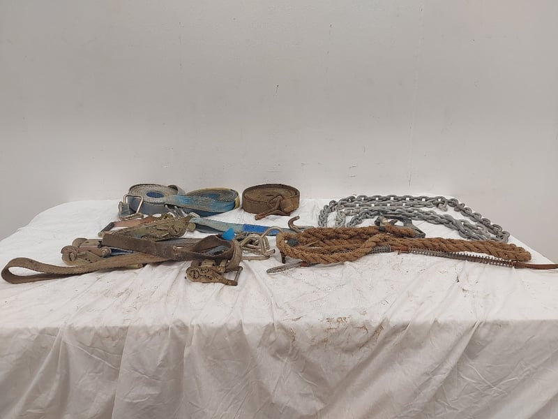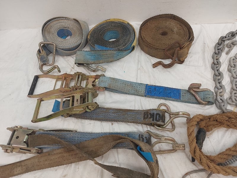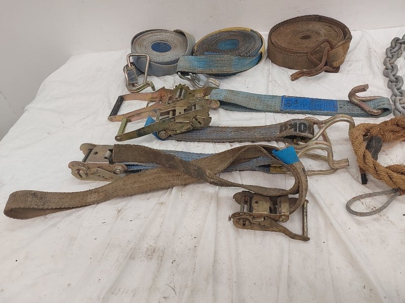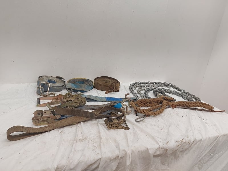 Assorted Lot Includes Ratchet Straps And Ratchets, Chains, Rope With Hook, Sizes Unknown, Quantity 12 Sold As Lot
