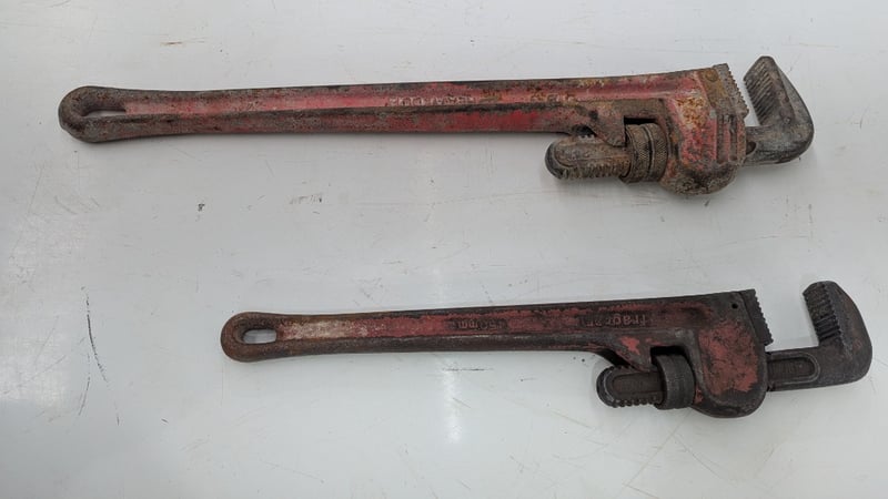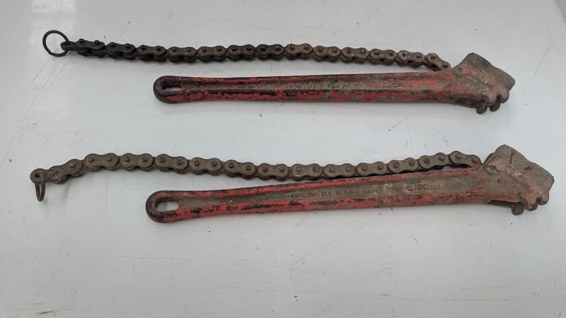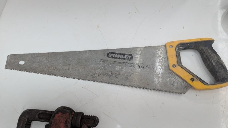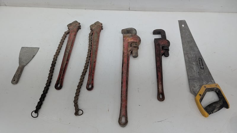 Assorted Tools, Including Chain Pipe Wrench, Straight Pipe Wrench, Hand Saw and More, Quantity 6Sold As Lot