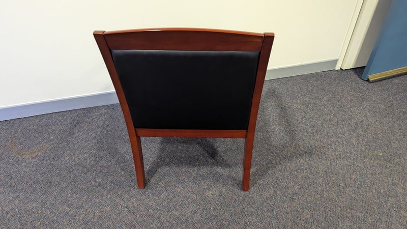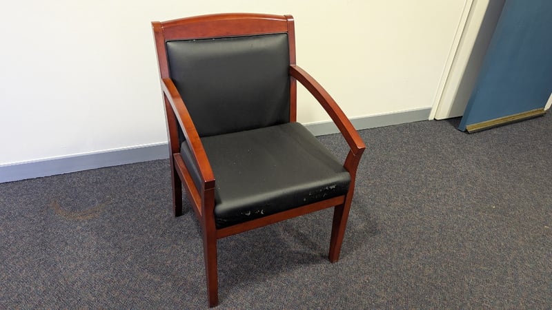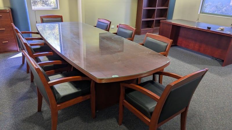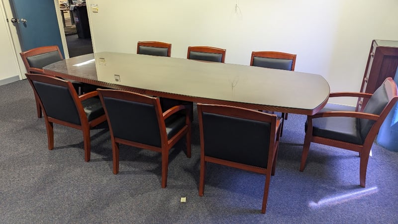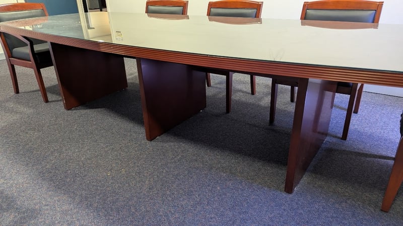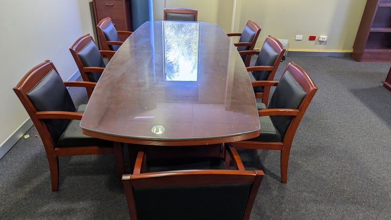 8 Seater Dining/Meeting Table, Glass Top, Central Support, 8 Timber Chairs, With PU Cushions, Dimensions 74cm(H)×306cm(W)×122cm(D), Chair:85cm(H)×54cm(W)×65cm(D)Sold As Lot Note: Some Chairs Have Cushion Damage