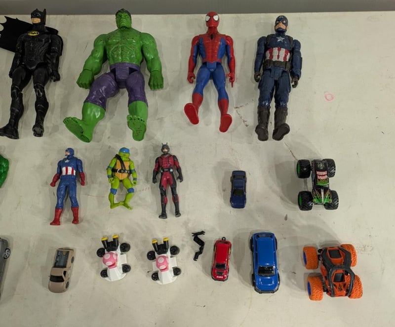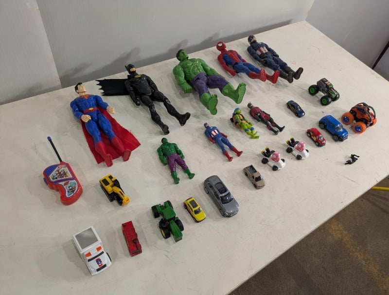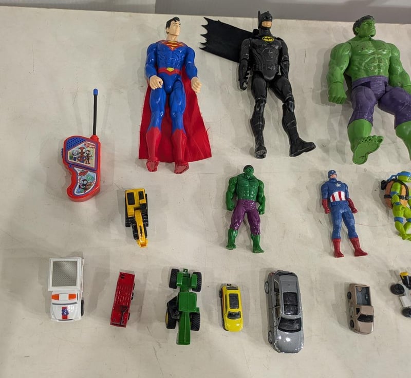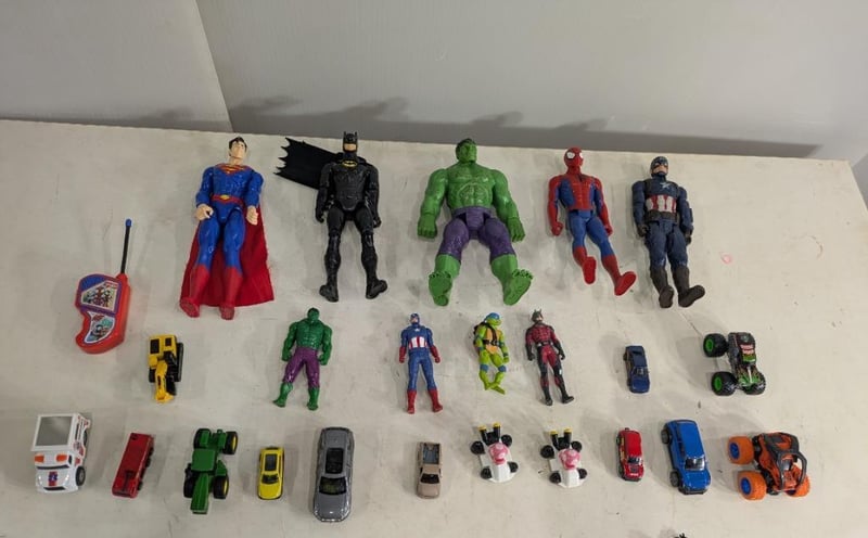 Box with Various and Assorted Kids Toys including Superhero Figurines, Mini Cars and More. Sold as Lot.