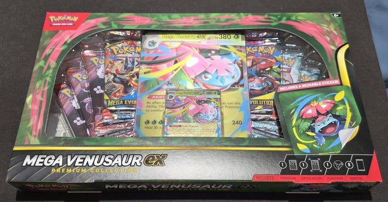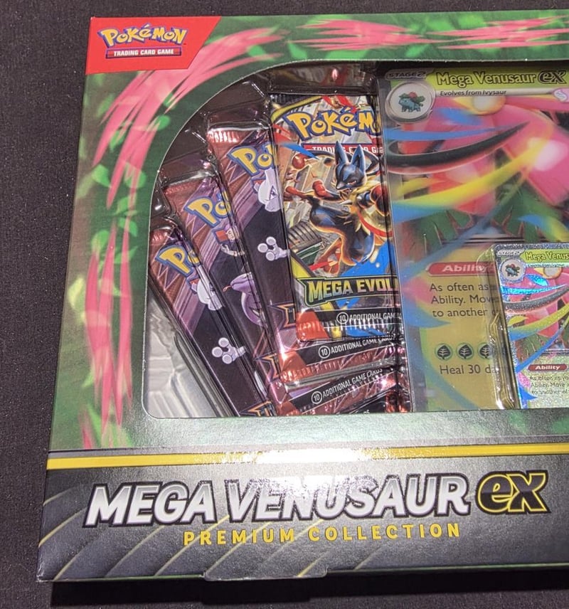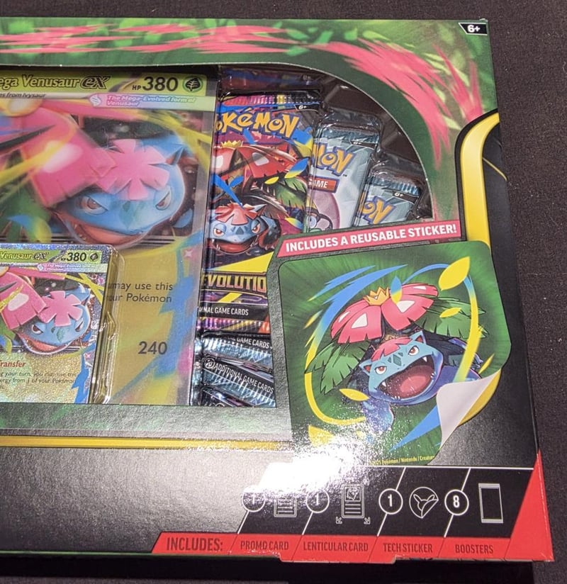 POKEMON TCG EX BOX, MEGA VENUSAUR EX, PREMIUM COLLECTIONPremium Collection Includes, 1 Foil Promo Featuring Mega Venusaur Ex, 1 Oversize Lenticular Promo Card, 1 Tech Sticker, 8X Pokemon Tcg Mega Evolutions Booster Packs. Condition: Good - Refer To Images584435+3