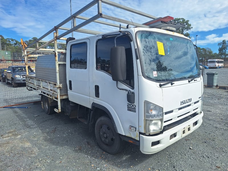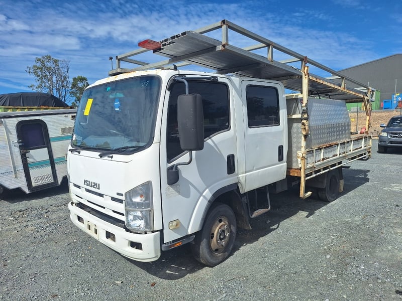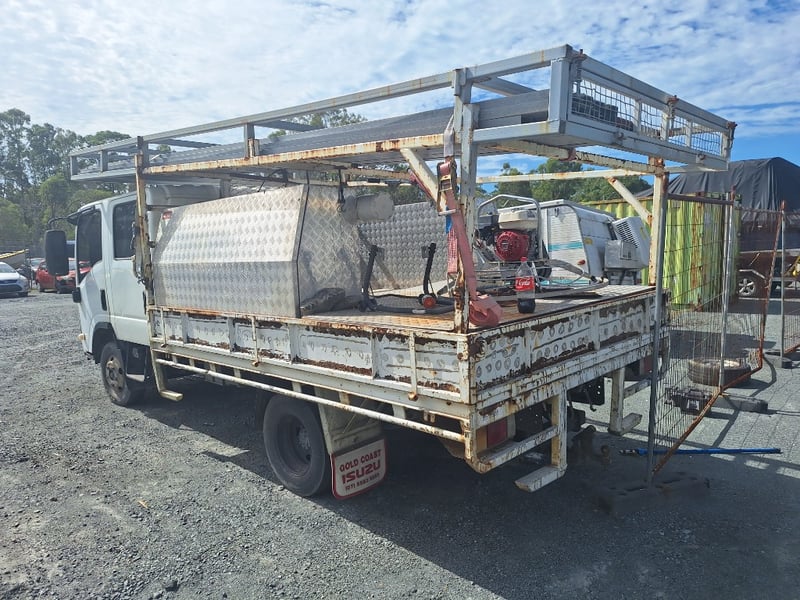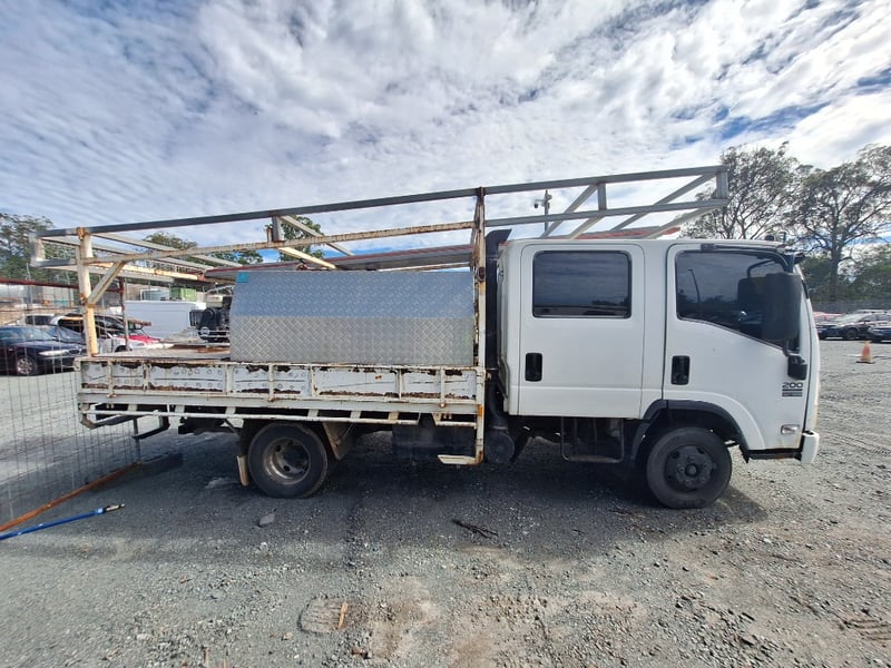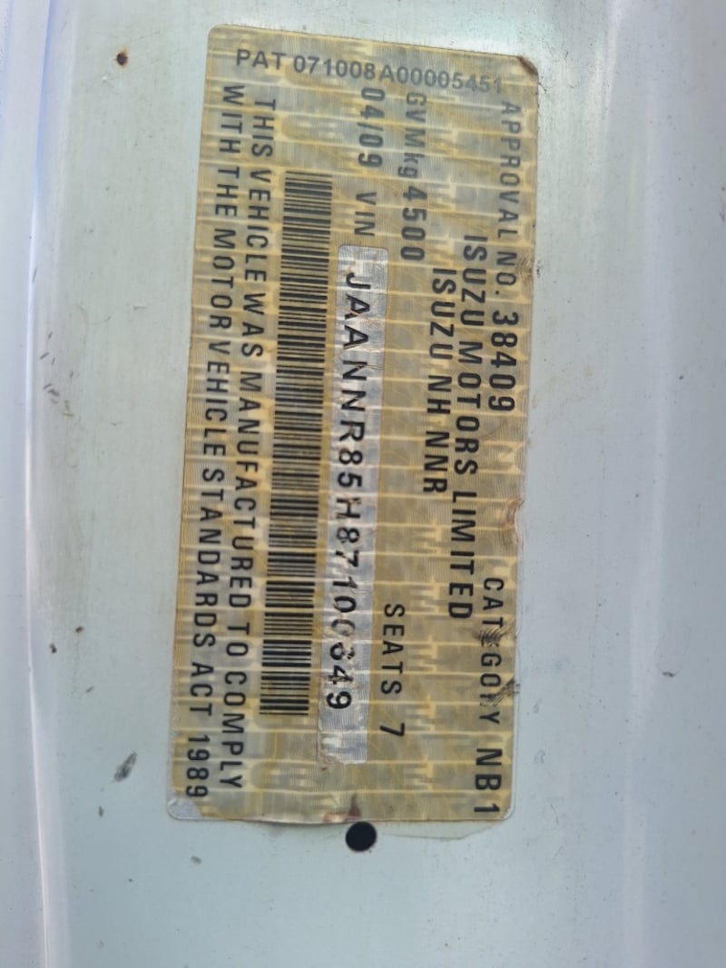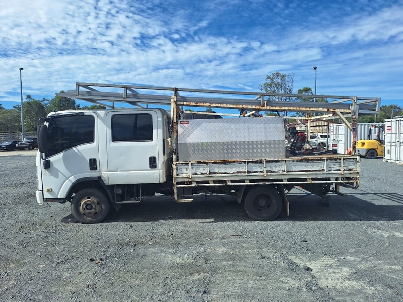 2009 ISUZU NNR SERIES TRAY TRUCK Year: 2009 Make: Isuzu Model: NNR200 VIN: JAANNR85H87100649 Configuration: 4x2 Engine: 4-Cylinder Turbo Diesel Transmisson: 5-Speed Manual Colour: White Description: NNR200 Crew Cab, Stereo, Air-Conditioning, Power Windows, Idle Control, Exhaust Brake, HSA, Side Mounted Toolboxes, Tow Hitch, Top Mount Storage Rack, Concrete Fan, Black Rims Asset No: 1628202 Location: Pimpama, QLD