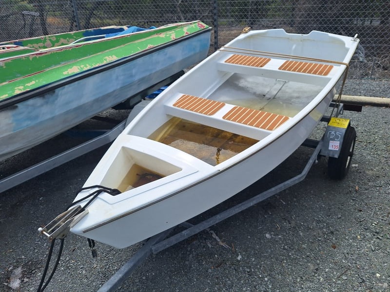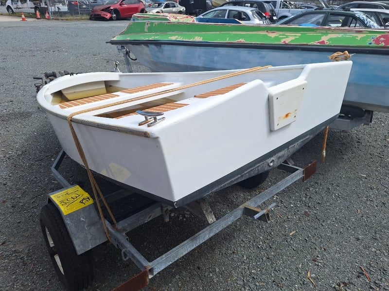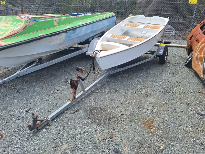 Boat And Trailer, Single Axle Boat Trailer, 50mm Hitch, Winch, Includes Fibreglass Small Boat (Hull Only), Approximate Trailer Dimensions 4200mm (L) 1480mm (W) VIN: Unsighted Asset No: 1676768 Location: Pimpama, QLD