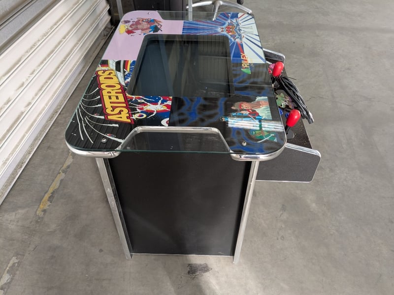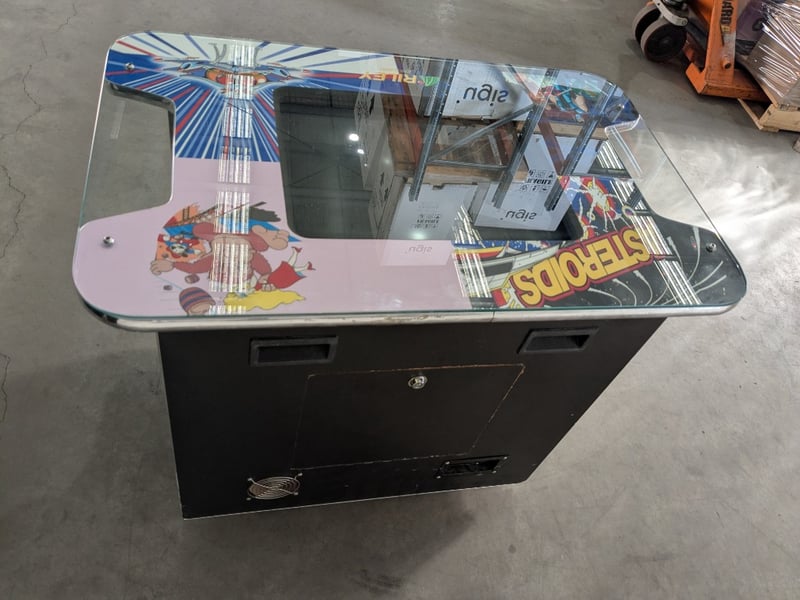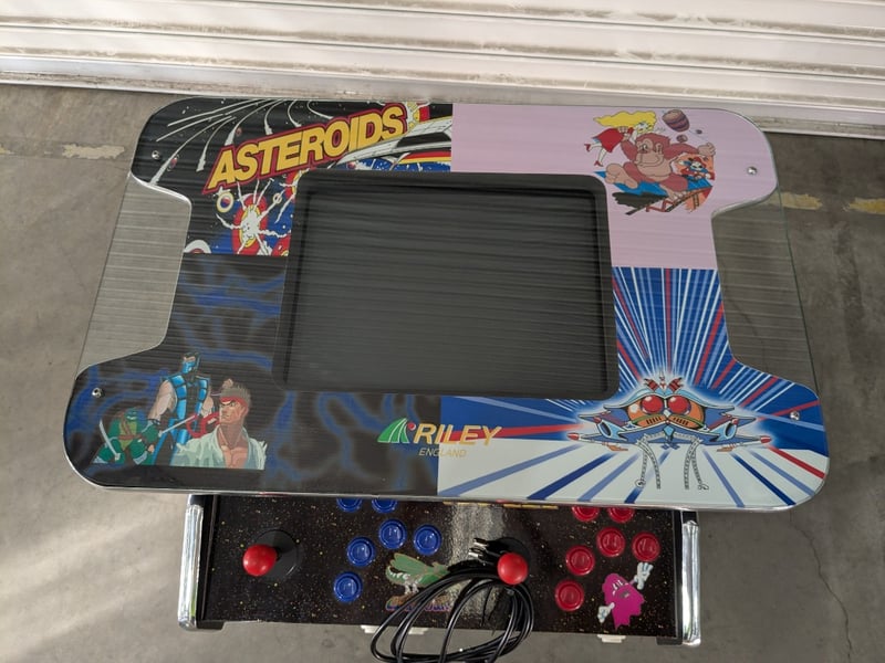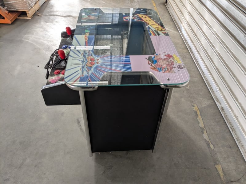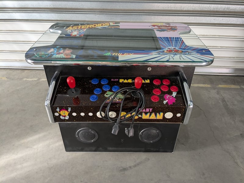 Cocktail Arcade Machine, Riley England, 5000 games, Comes with Keys. Dimensions- 70h X 87w X 65d. Games List: Ms Pac-Man / Galaga / Frogger /Donkey Kong / Donkey Junior / Donkey Kong 3 Galaxian / Dig Dug / Crush Roller / Mr. Do / Space Invaders / Pac Man Galaga 3 / Gyruss / Tank Battalion / 1942 / Lady Bug / Burger Time Mappy / Centipede / Millipede / JR Pacman / Pengo / Phoenix Time Pilot / Super Cobra / Hustler / Space Panic / Super Breakout / New Rally X / Arkanoid / Qix / Juno First / Xevious / Mr. Do's Castle / Moon Cresta Pinball Action / Scramble / Super Pacman / Bomb Jack / Shao-Lin's Road / King & Balloon 1943 / Van-Van Car / Pacman Plus / Dig Dug 2 / Amidar / Zaxxon / Pooyan / Pleiads / Gun Smoke / The End / 1943 Kai / Congo Bongo / Jumping Jack / Ms Pac-Man (fast mode) / Pac-Man (fast mode) / Galaga (fast fire mode) / Jr Pac-Man / Pac-Man Plus