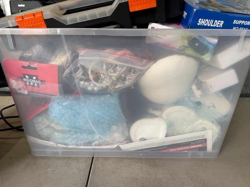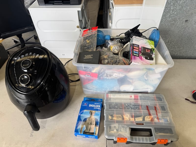 Assorted lot of D.I.Y items including air fryer, shoulder support, welding electrode holders and more Note: Sold as Lot