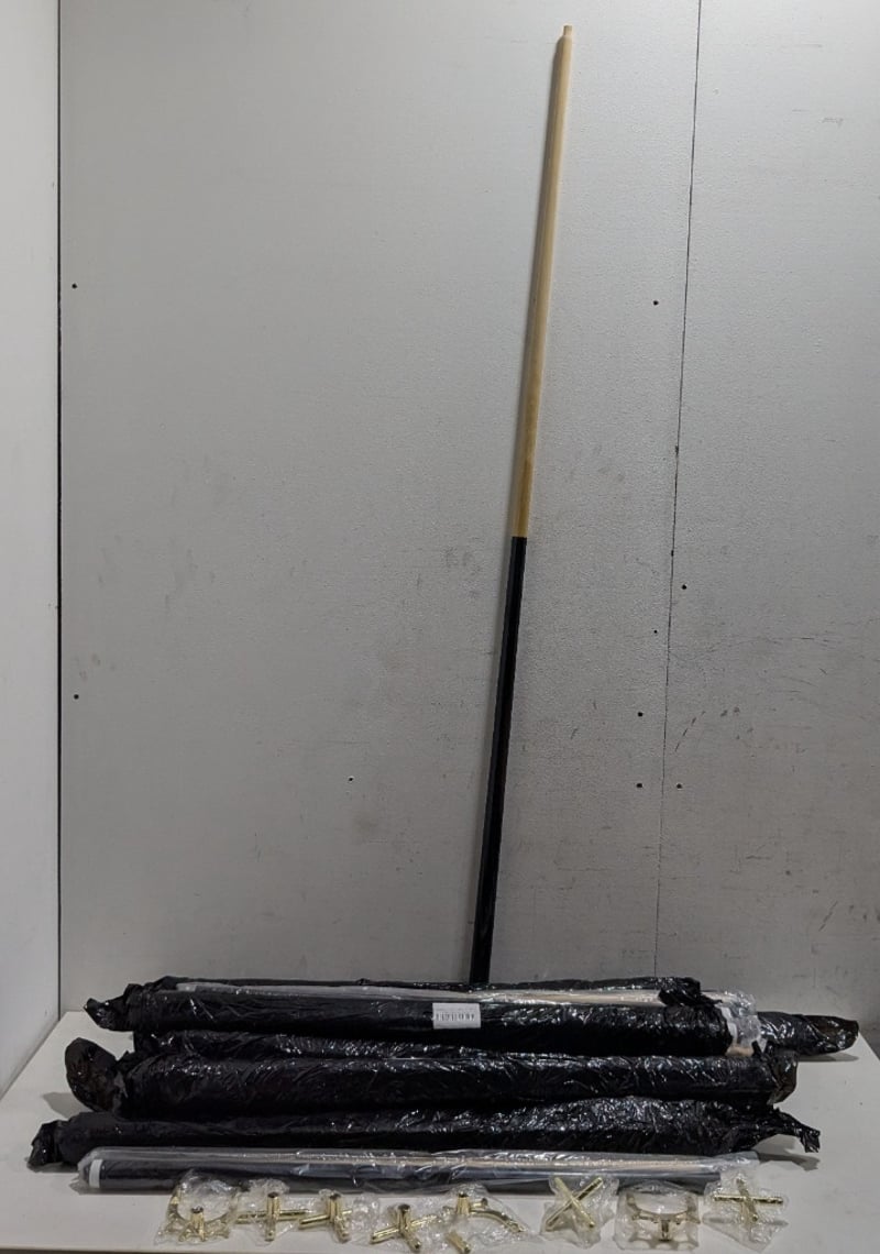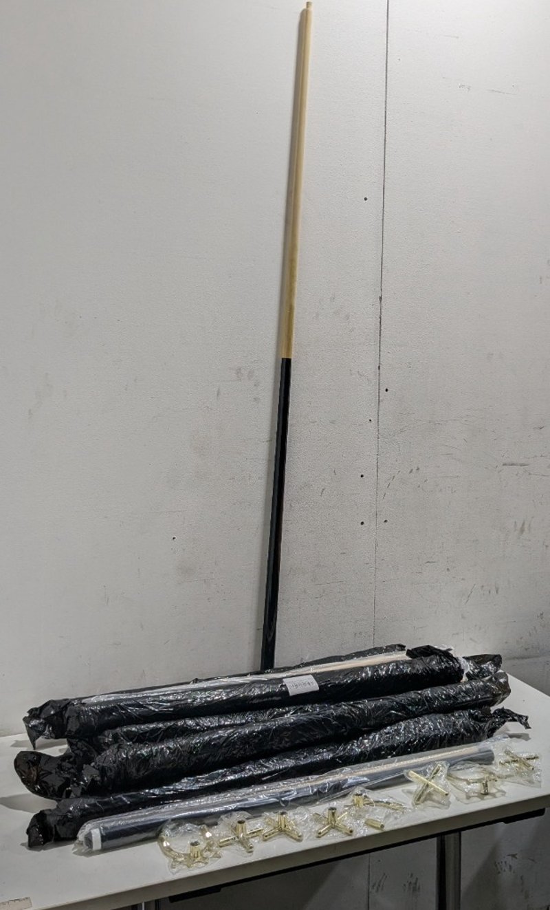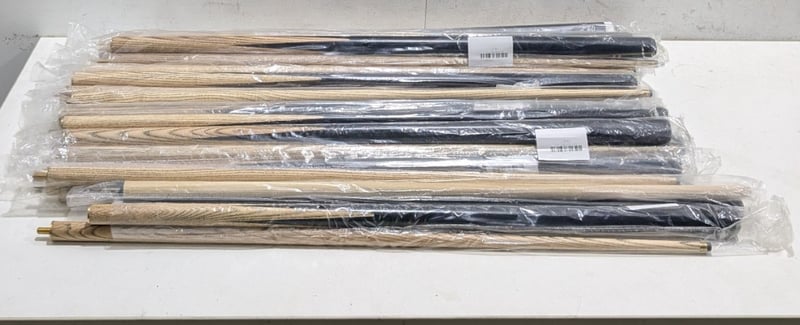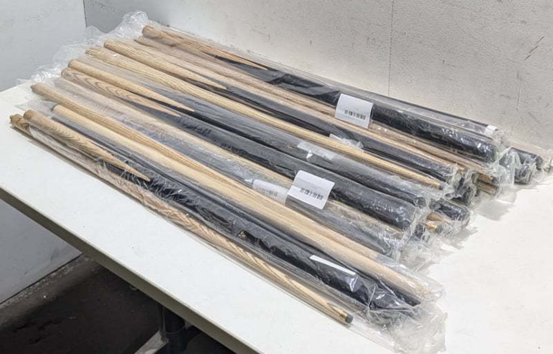 Lot of pool cue sticks with, wood-like, includes pool cue accessories Note:untested, signs of wear ,missing pool cue tips