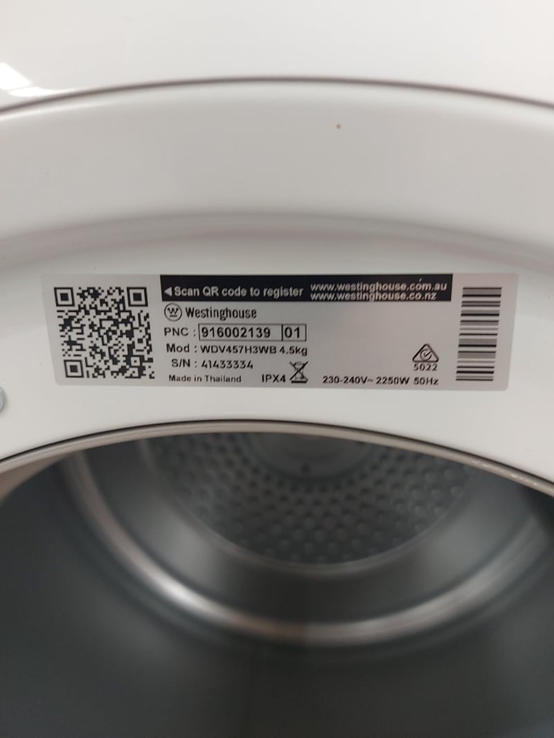 Dryer Westinghouse Easycare 4.5kg, Model WDV457H3WV, Dimensions: 80cm(H) 60cm(W) 50cm(D)