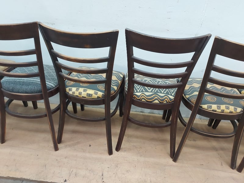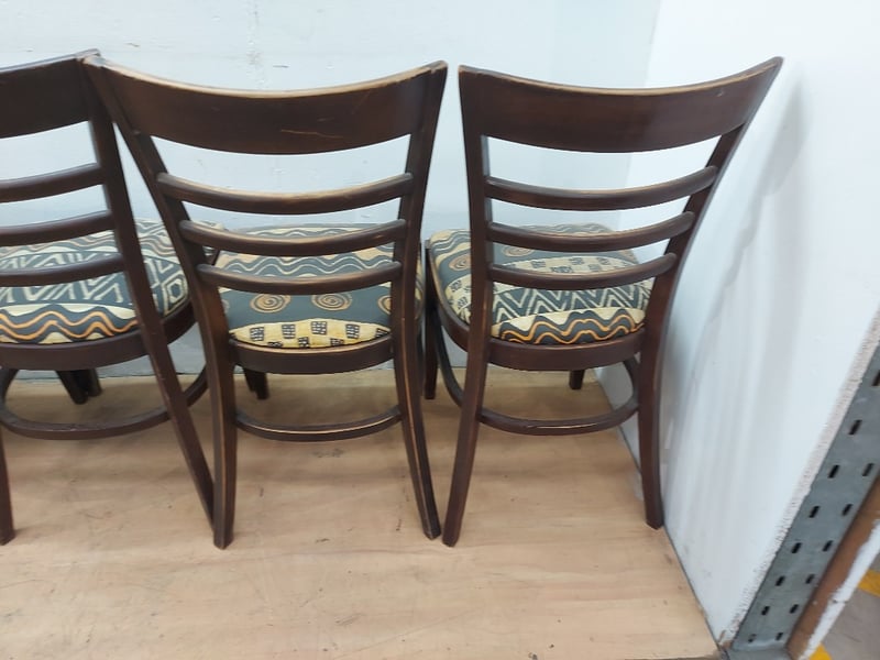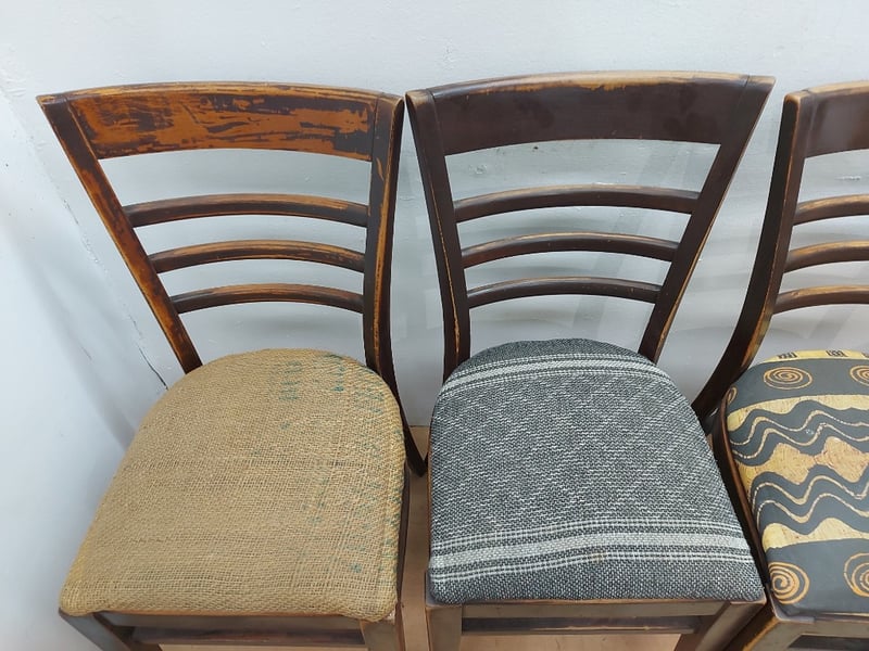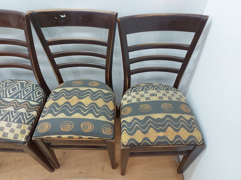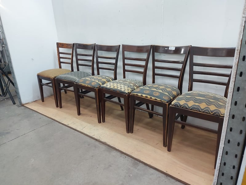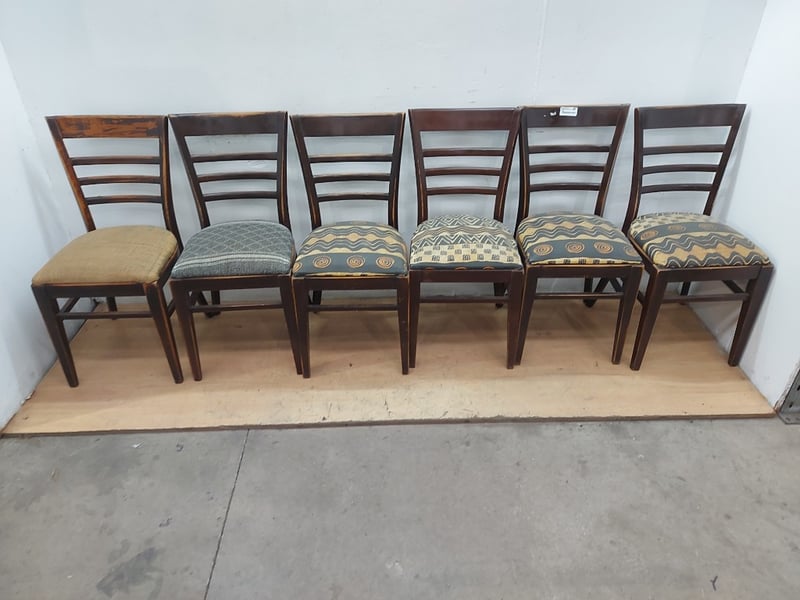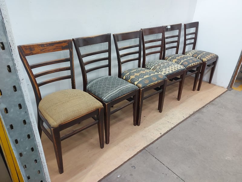 Timber Dining Chairs, Distressed Look, Fabric Cushions, Dimensions 83cm(H)×40cm(W)×47cm(D), Quantity 6