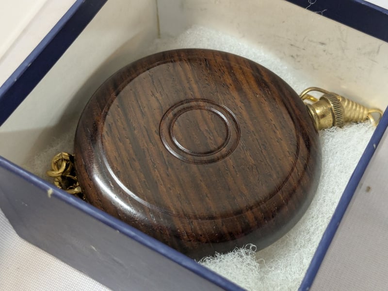 TIMBER CASED QUARTZ POCKET WATCH WITH CHAIN