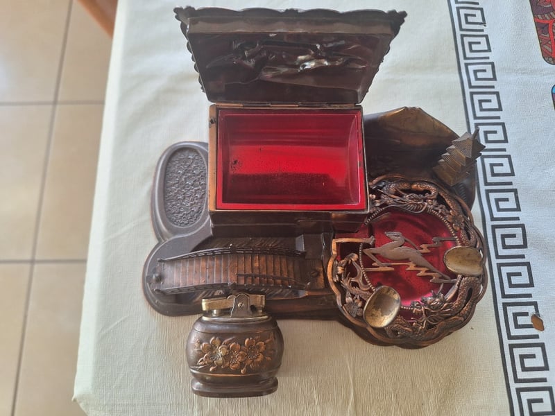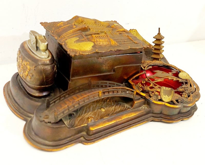 JAPANESE STYLED BRASS LIGHTER HOLDER AND ASHTRAY