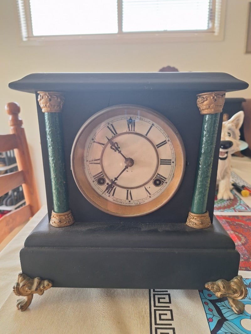 White Dial With Roman Numerals, Marble Styled Columns, Key And Pendulum Weight Inside